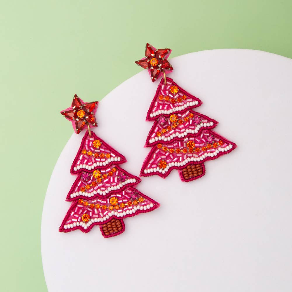 Bring sparkle and cheer to your holiday season with these Christmas Tree post dangle earrings, intricately designed with seed bead detailing and radiant rhinestone accents. Topped with a glittering star and full of festive color, these handcrafted-style earrings offer joyful texture and eye-catching movement. Lightweight and comfortable with a secure post back, they’re a dazzling choice for holiday parties, family photos, and festive gatherings.