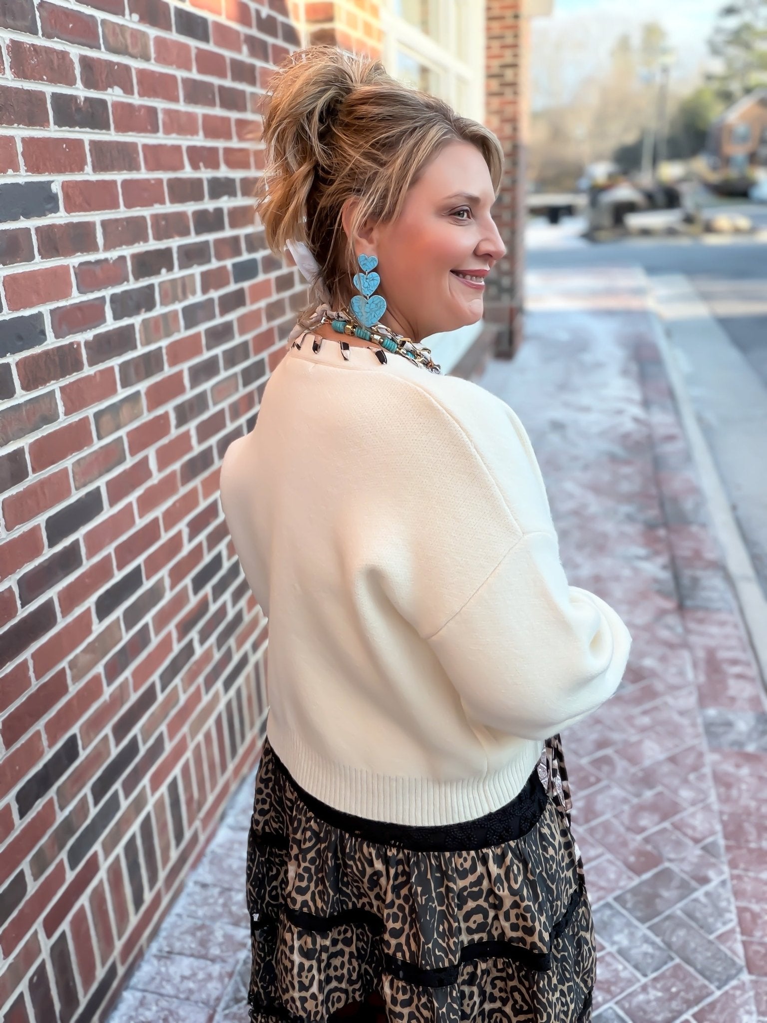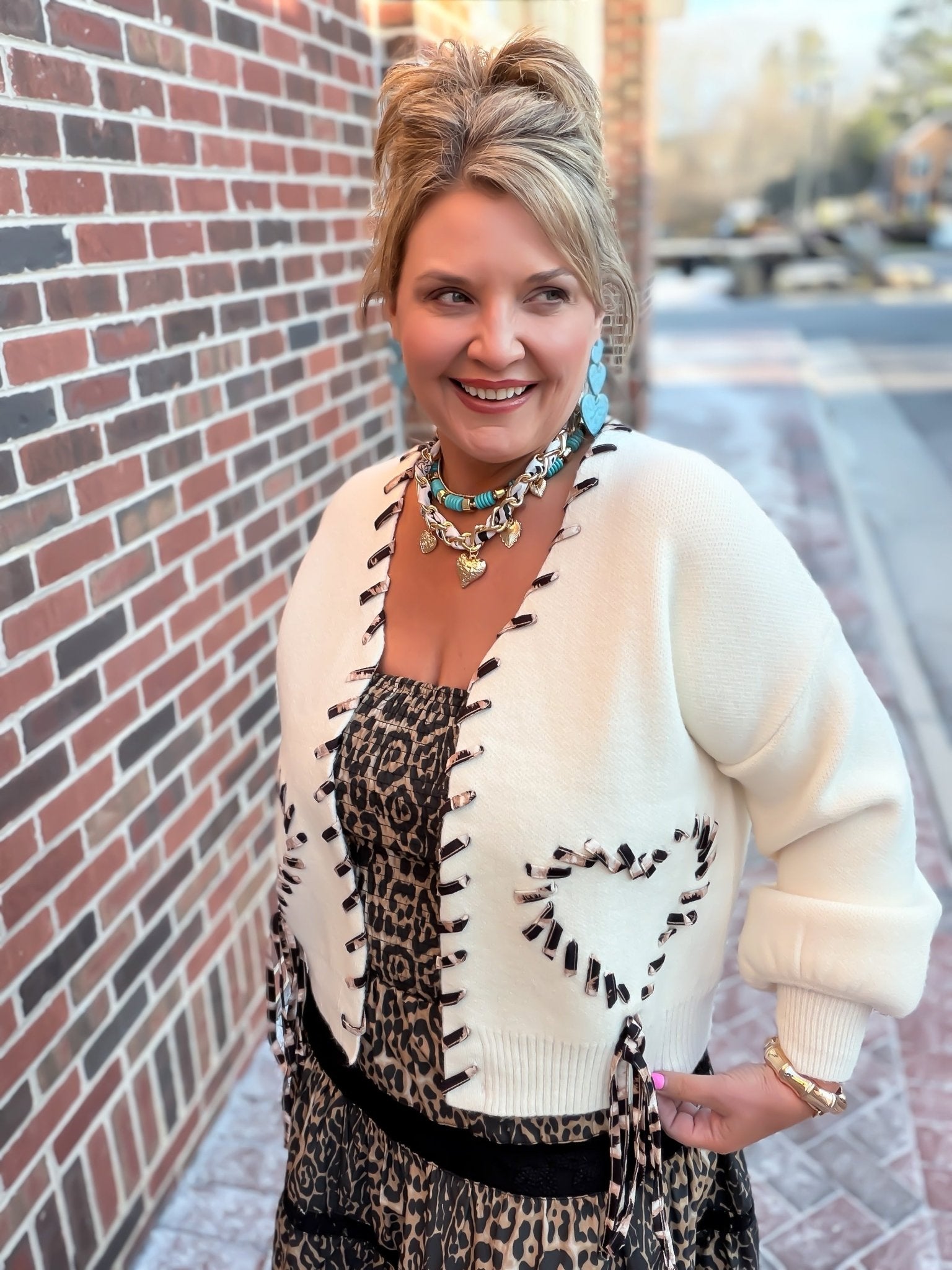 Elevate your everyday wardrobe with the Wild at Heart stunning leopard print lace-up cardigan. Crafted from a premium, ultra-soft knit fabric, this versatile sweater features a unique animal print whipstitch detail that traces the neckline, sleeves, and front bodice into charming heart shapes. With its relaxed fit, classic V-neck, and chic ribbed cuffs, this cardigan is the perfect blend of cozy comfort and bold, boutique-style fashion.