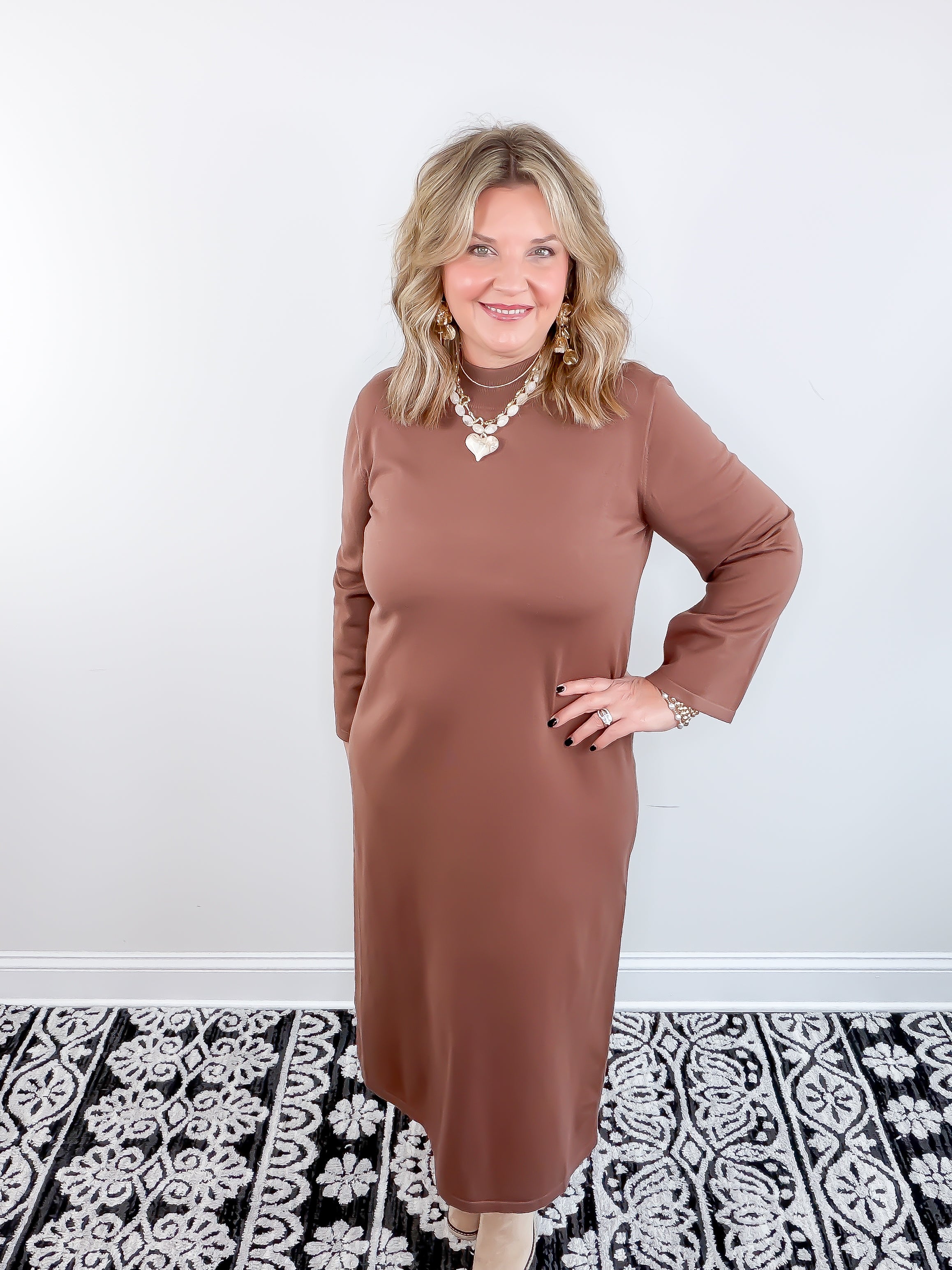 Step into effortless style with the Timeless Ease Midi Dress. This solid knit dress features a cozy mock neck and long sleeves, perfect for cooler days. Its medium-weight fabric is non-sheer, offering comfortable coverage without the need for lining. Whether you're dressing up or down, this midi length piece brings playful sophistication to your wardrobe with ease.