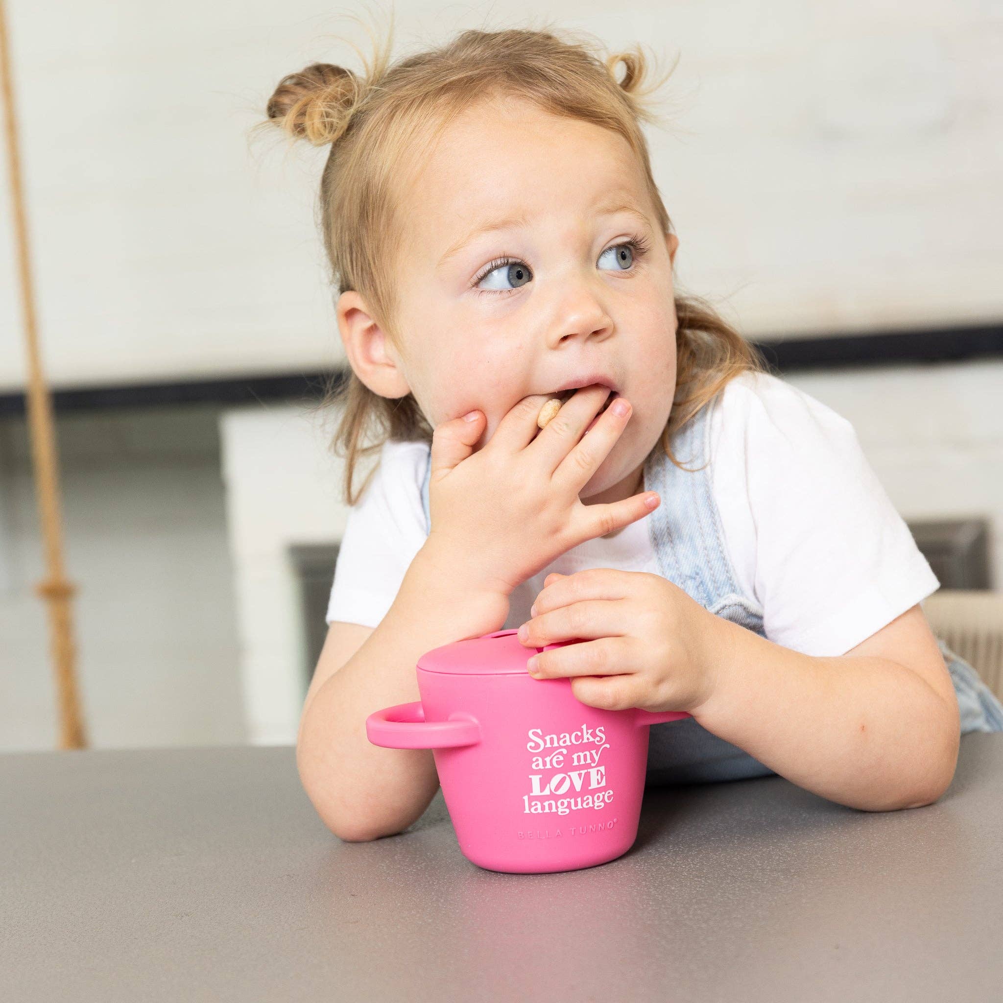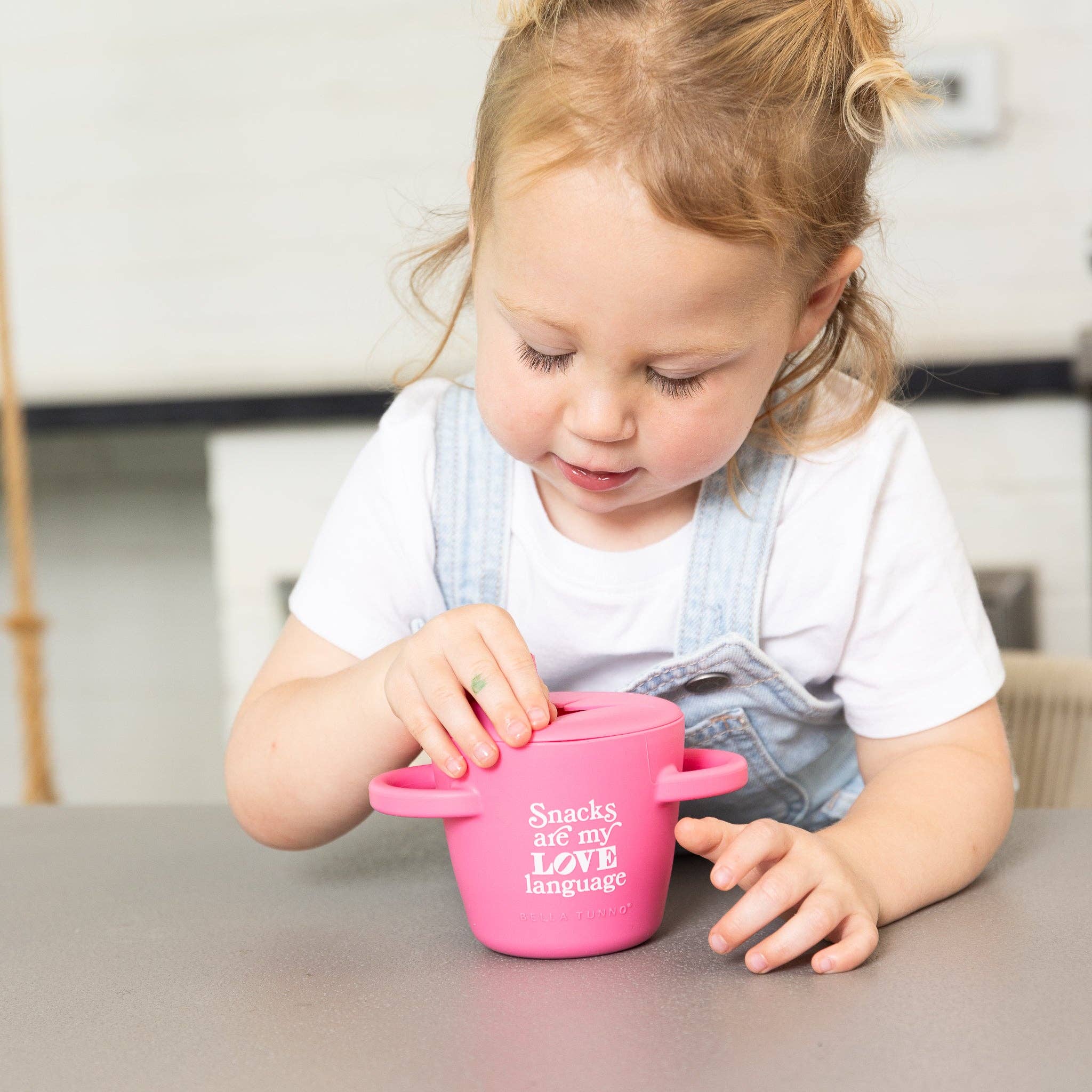 The Bella Tunno Happy Snacker is a first-of-its-kind two-piece silicone snack cup with a mess-proof snap-tight lid and soft silicone opening so little hands can easily access food and prevent spills. Designed with easy-grip handles, it fits in car seats and stroller cup holders.