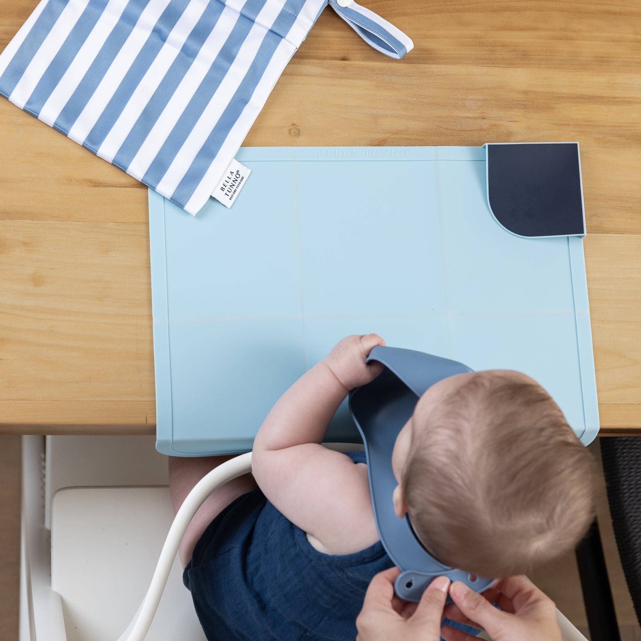 The silicone Beginner Bib has a narrow body for little arms to easily reach the eating surface and food. -The Wonder Mat is the first-of-its-kind foldable placemat with Table Guard technology, a 2" flap to cover the front of the eating surface and keep the entire eating area both clean and protected. -The waterproof Wet Bag has a front zipper pocket for bib + placemat and a back zipper pocket for food and snacks. -