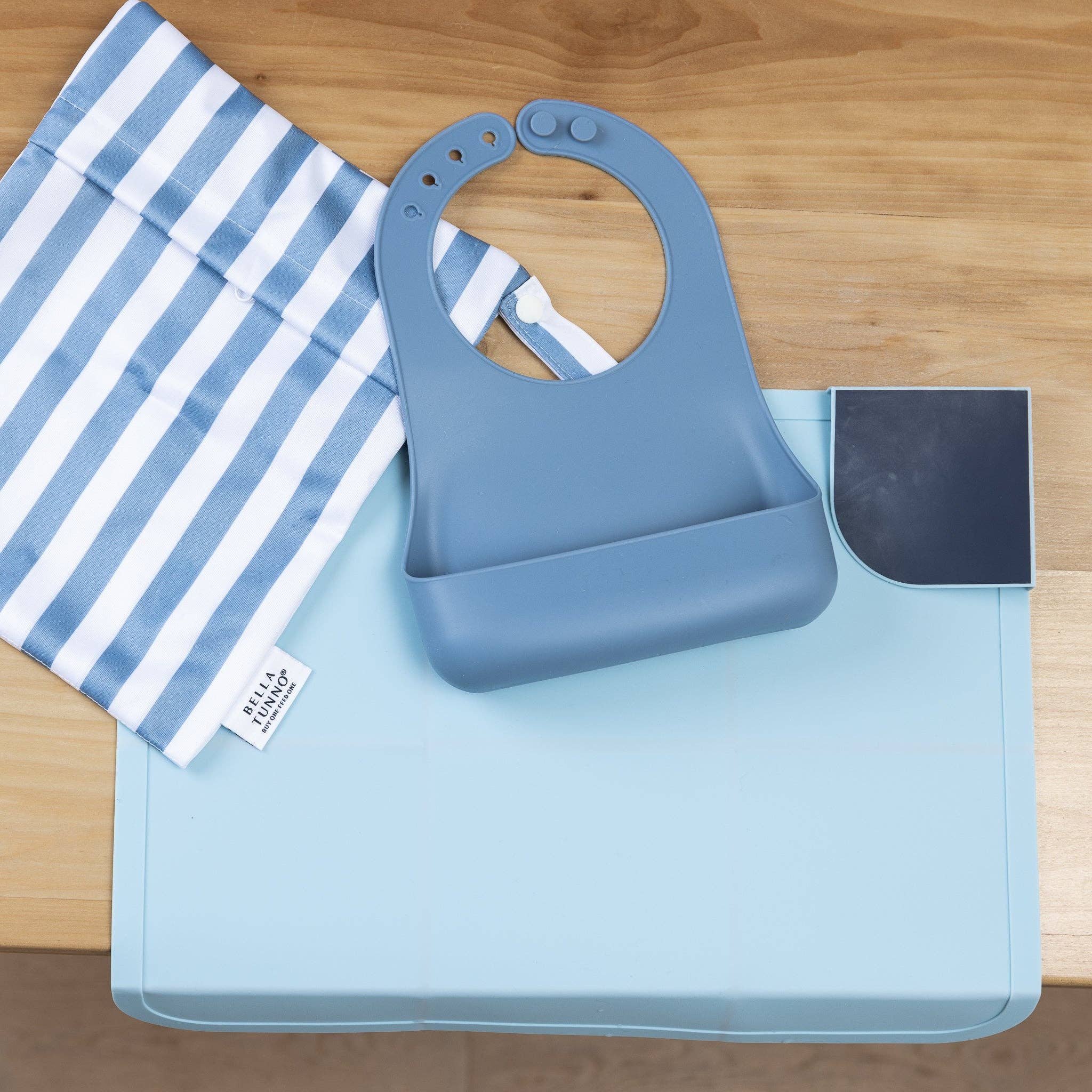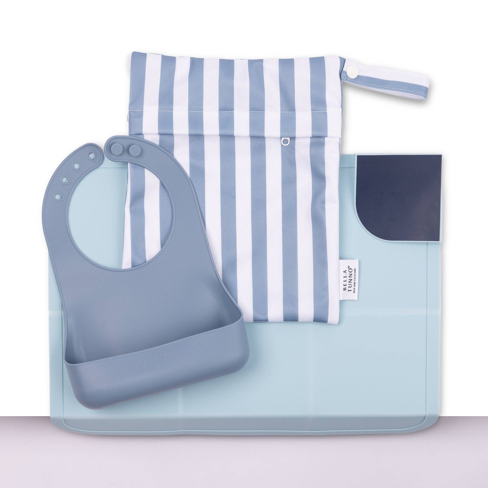 One set includes everything you need: beginner bib, placemat, and wet bag. -