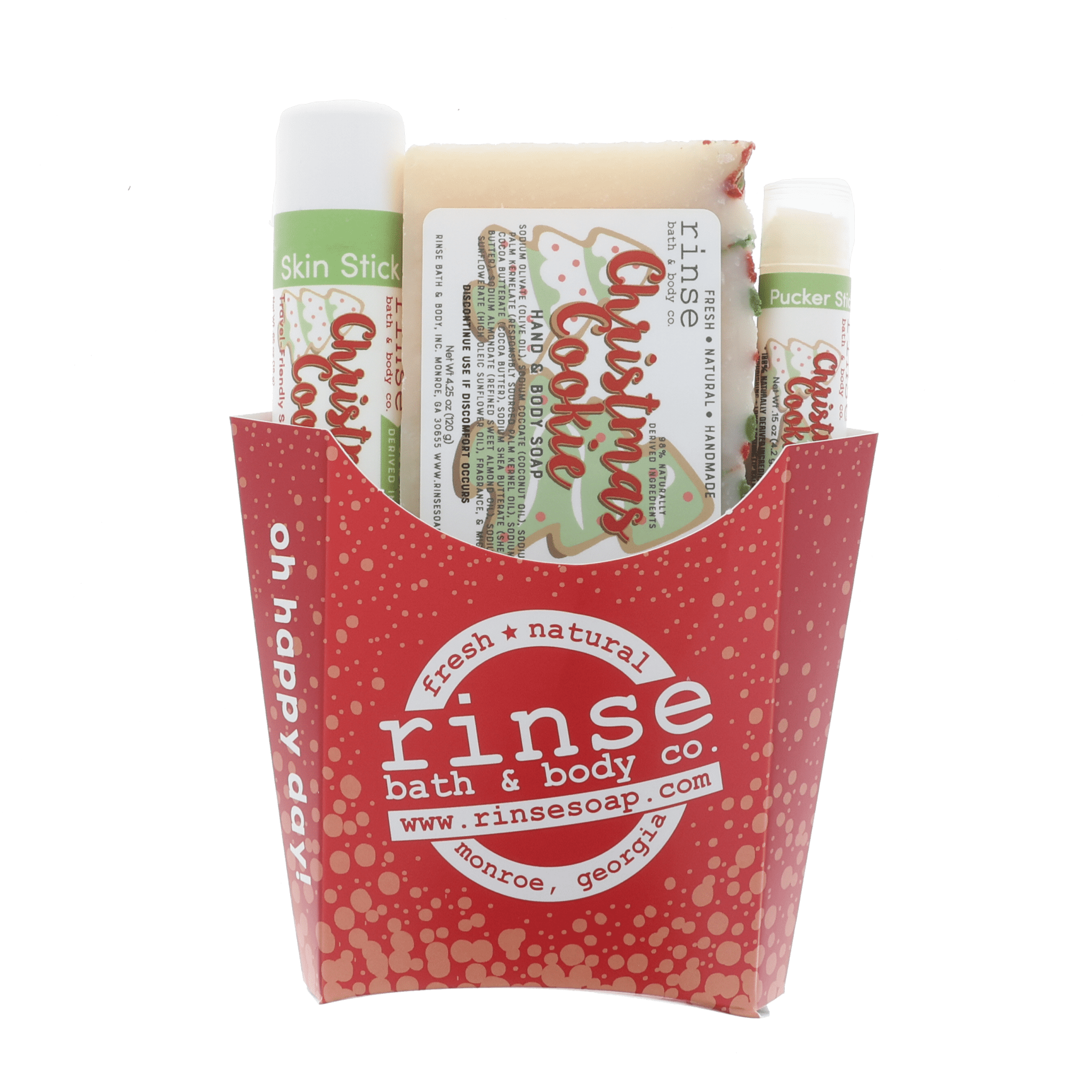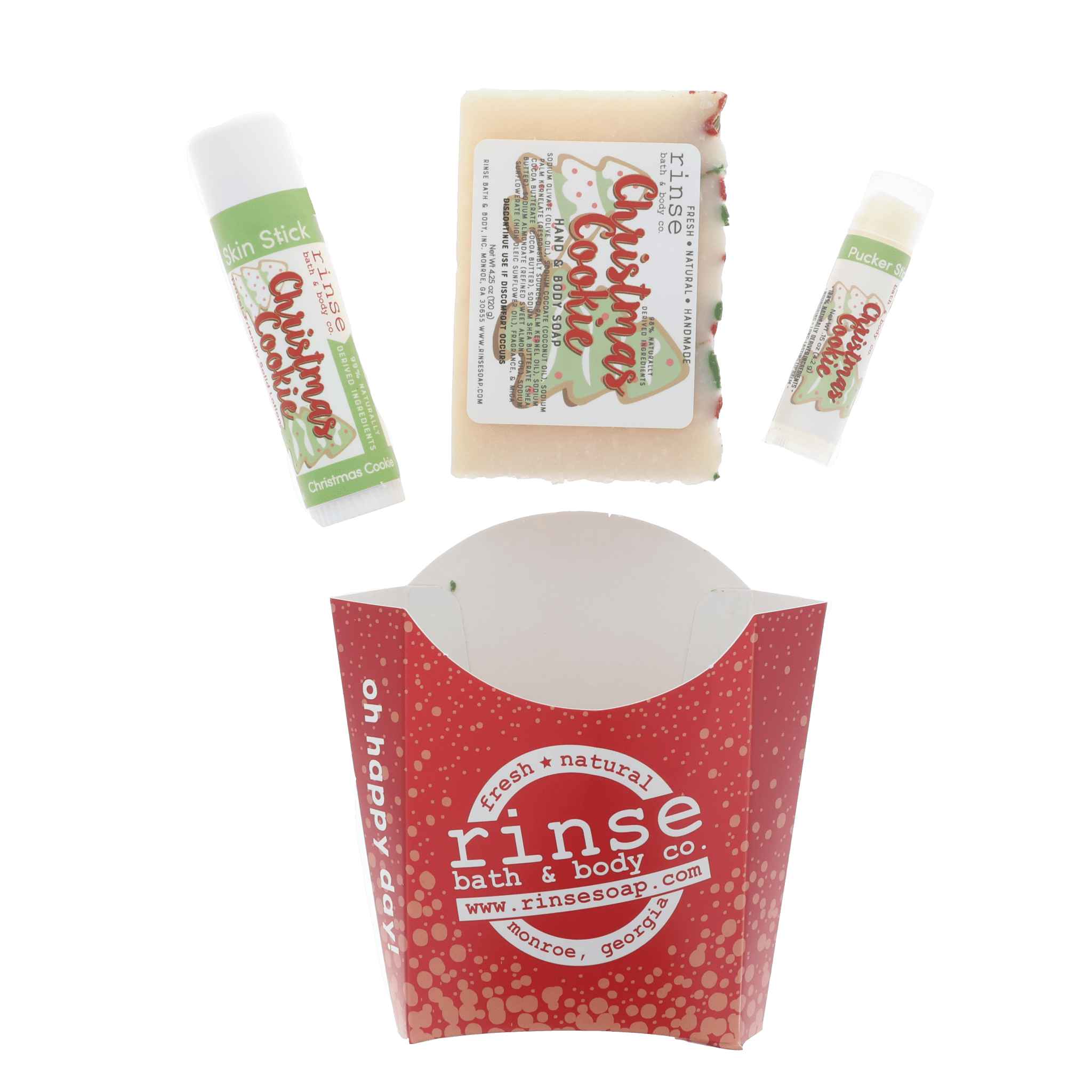 You'll receive a Christmas Cookie Soap, a Christmas Cookie Skin Stick, and a Christmas Cookie Pucker Stick all packaged up in a Fry Box and tied up in a cello bag with a ribbon. One less thing for you to worry about!