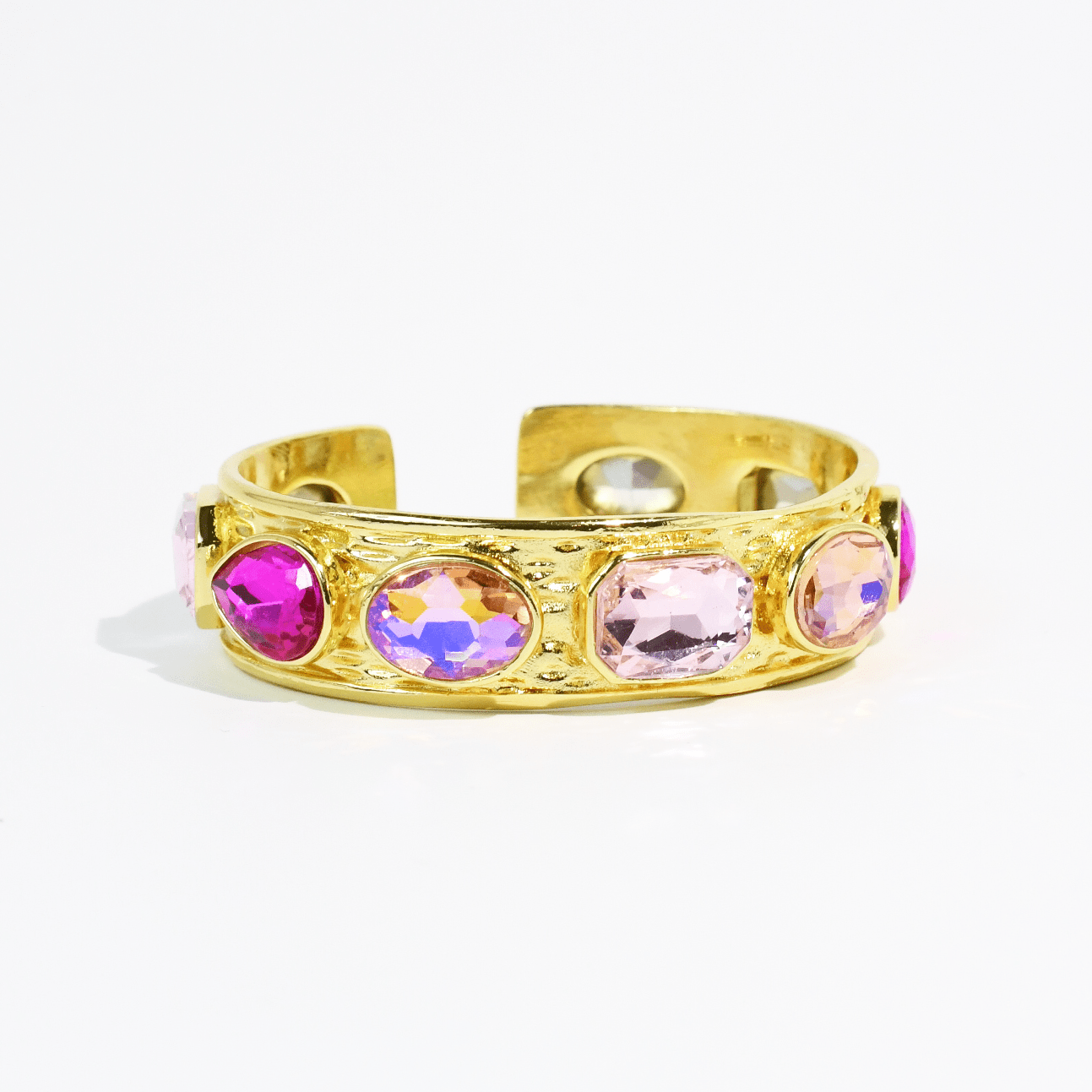 Elevate your look with this stunning Gold Crystal Statement Bangle featuring vibrant, light-catching crystals and a luxurious hammered texture. This adjustable statement piece offers a custom fit and high-impact shine for effortless everyday glamour.