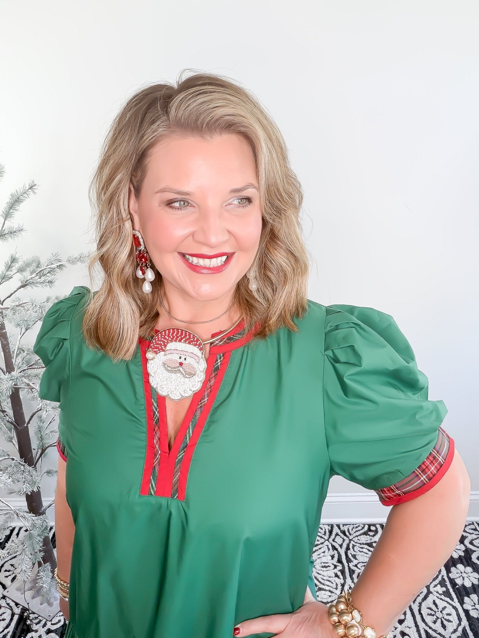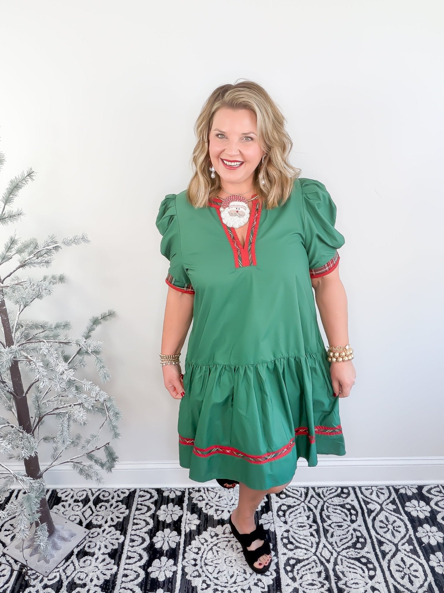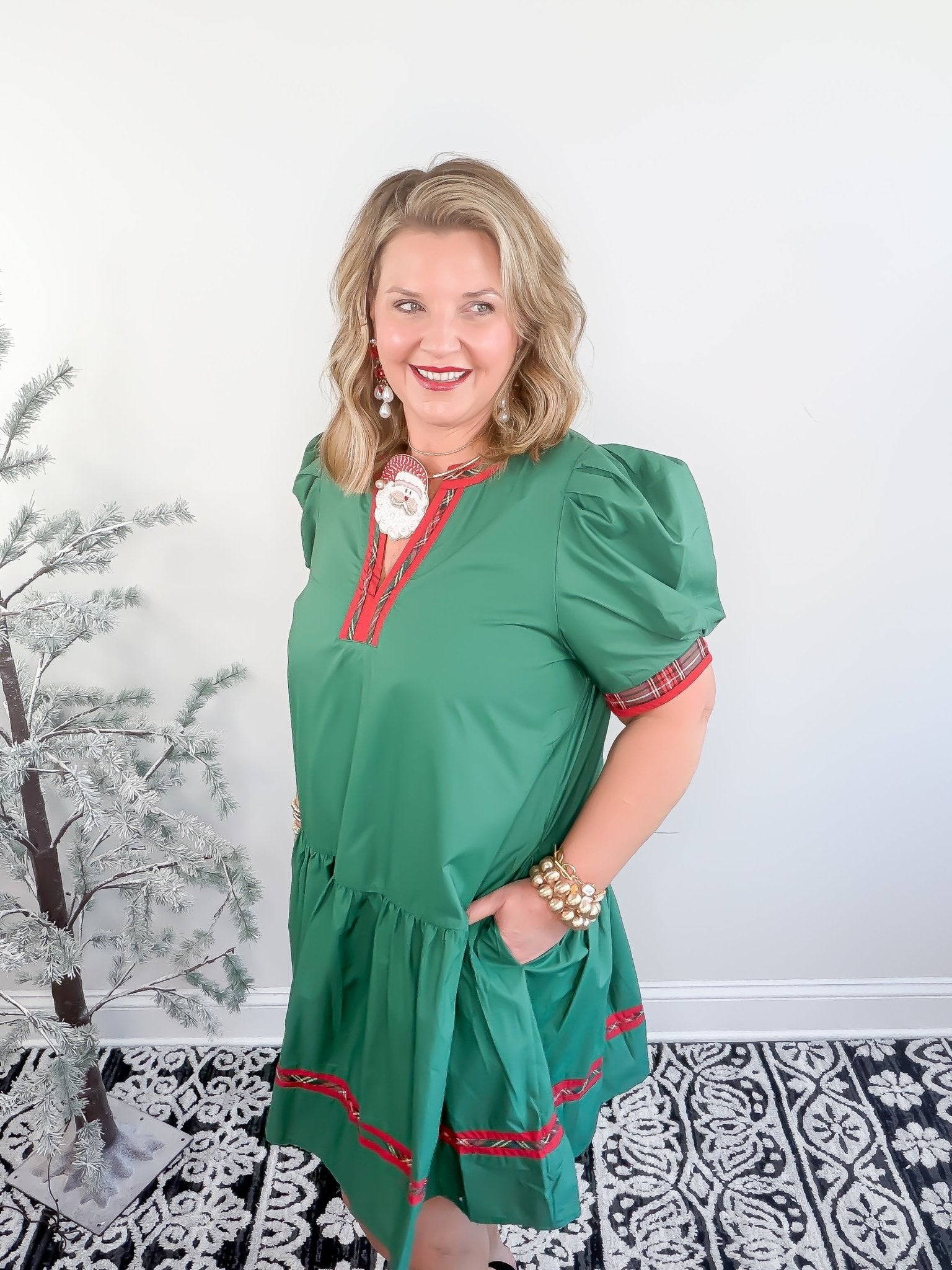 The Festive Hem Mini Dress brings a playful twist to your wardrobe with its charming puff sleeves and eye-catching plaid trim that accents the neckline, cuffs, and hem. Crafted from lightweight woven fabric that’s fully lined and non-sheer, it offers comfort and coverage without weighing you down. Plus, handy side pockets add a fun and practical touch for all your essentials. Perfect for those who love a flirty, festive look with effortless ease.