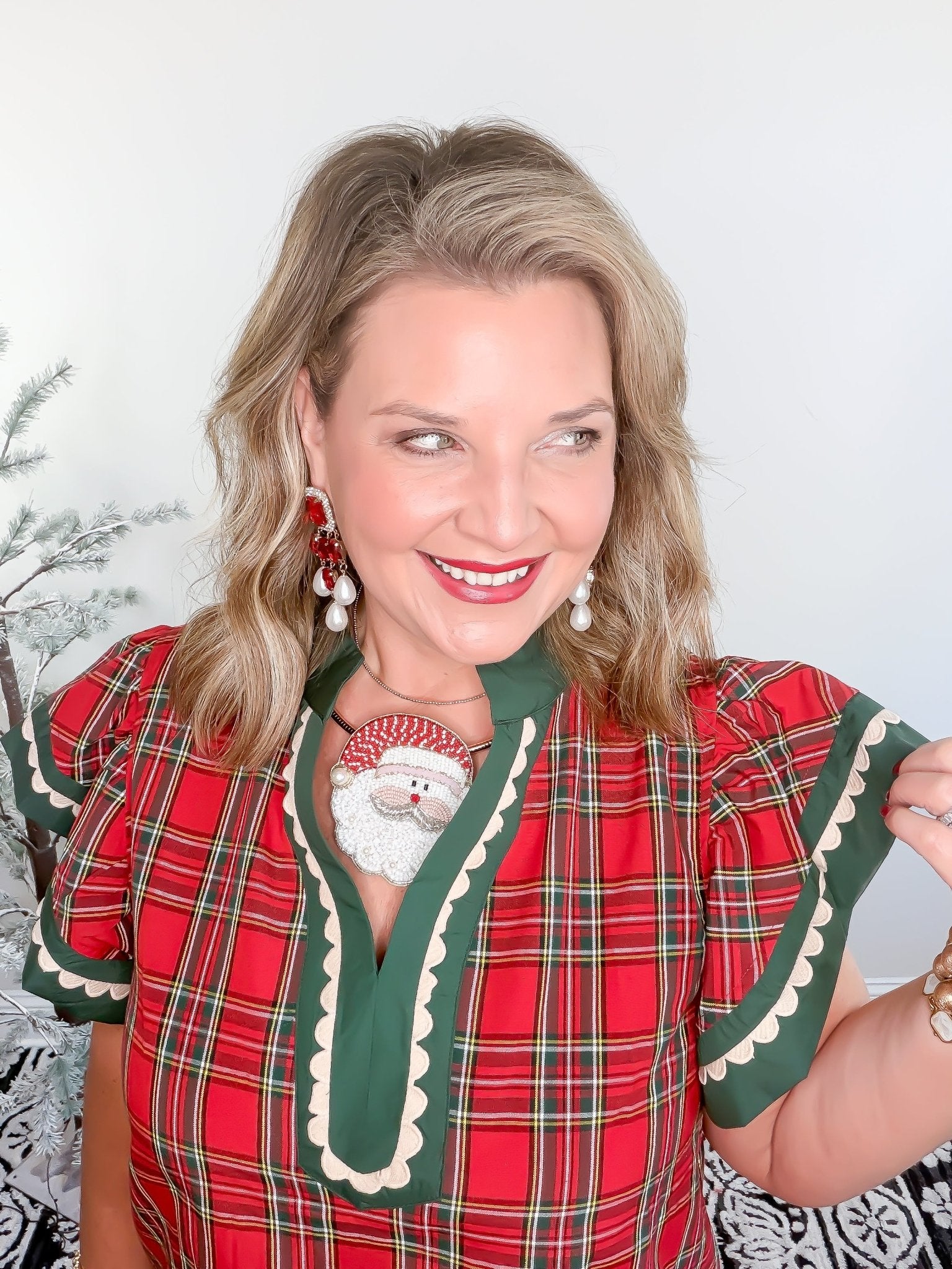 Add a touch of charm to your wardrobe with The Darling Plaid Blouse. This playful top features a scallop trim and flutter sleeves that dance with every move. The contrast V-neck and caftan-inspired band create a flattering silhouette, while the lightweight woven fabric keeps you comfortable all day long. Unlined yet non-sheer, it’s perfect for layering or wearing on its own for a breezy, fun look.