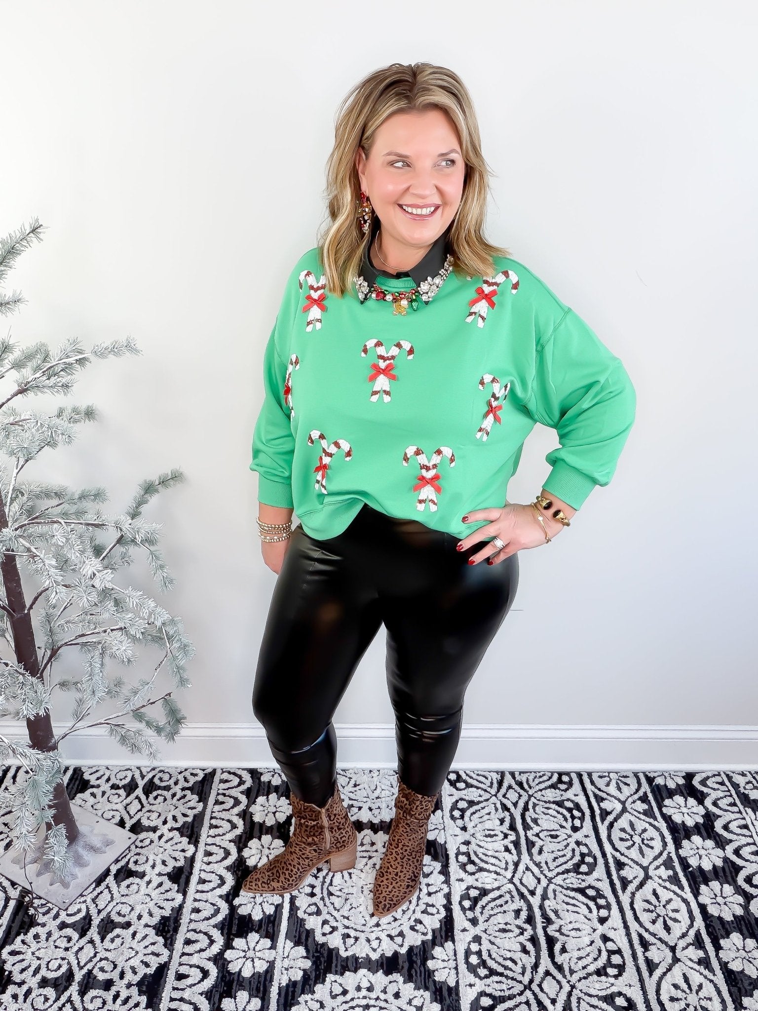 Get cozy this holiday season with the Peppermint Shine Sweatshirt, featuring a playful sequin candy cane pattern that sparkles with festive cheer. Its soft fabric keeps you comfy while adding a touch of holiday magic to your outfit. Perfect for spreading joy and staying warm during all your seasonal celebrations!