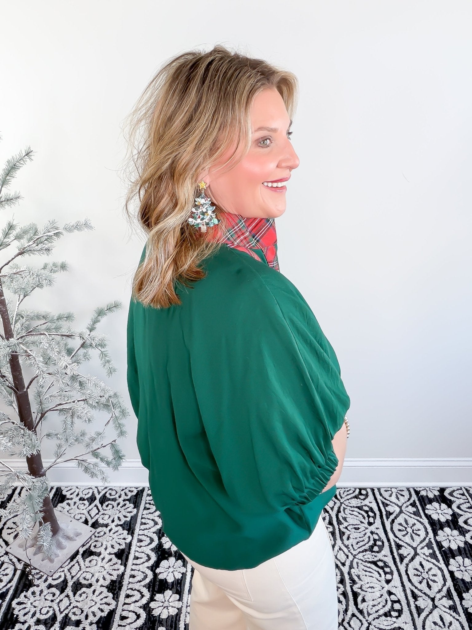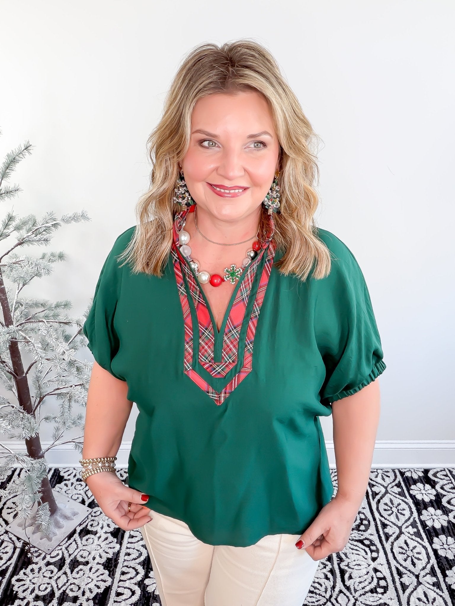 This playful Holiday Contrast Blouse mixes cozy plaid with a breezy, lightweight feel. Featuring a short sleeve dolman cut and a striking high V-neck band in plaid, it adds a fun twist to your outfit. Crafted from woven fabric that's unlined and non-sheer, it’s both comfortable and effortlessly stylish for festive days or casual outings.