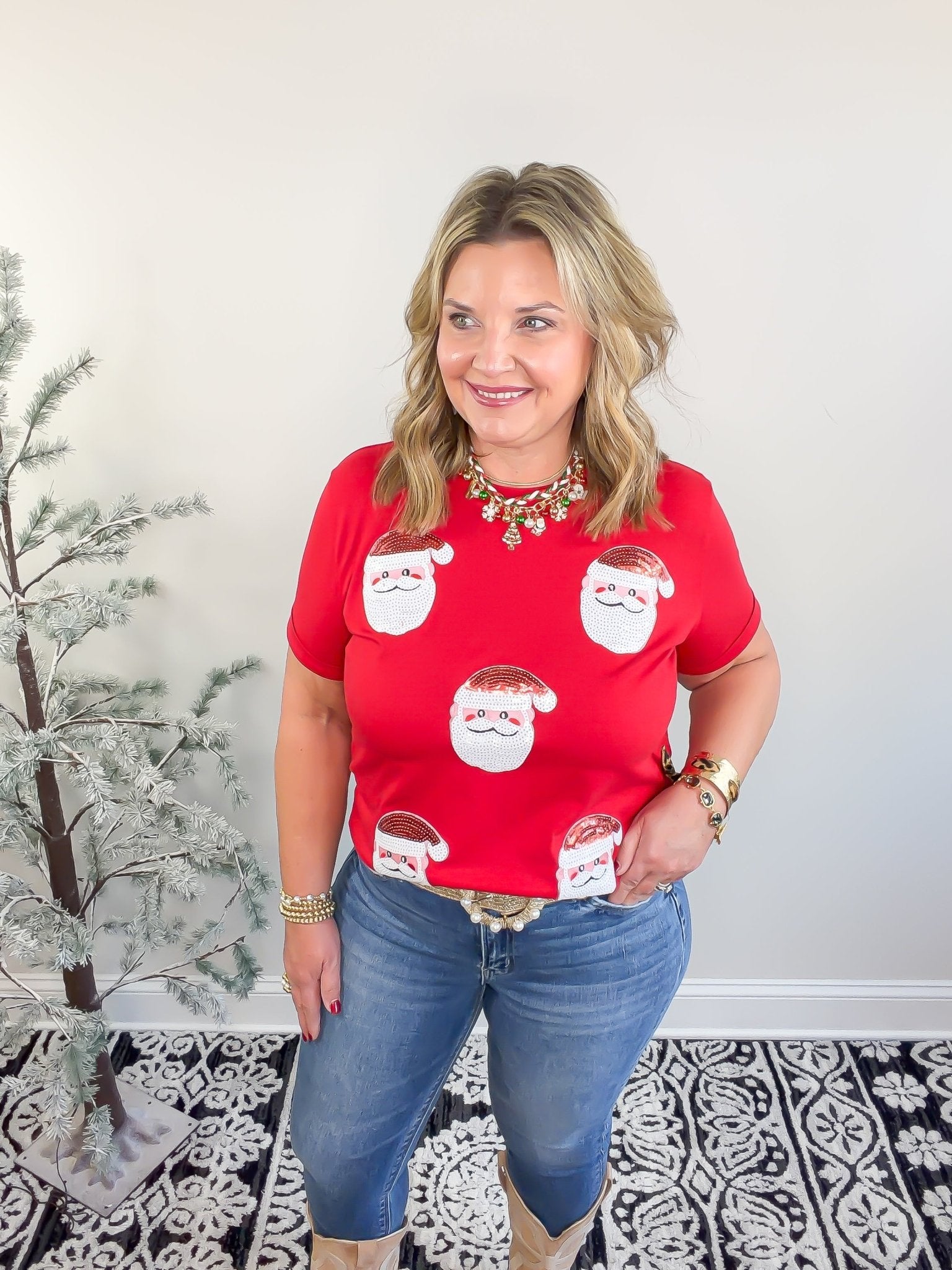 Get ready to sleigh the holiday season in this festive Santa Sparkle T-shirt! Featuring a jolly Santa graphic adorned with eye-catching sequins, this tee brings sparkle and cheer to your seasonal wardrobe. Perfect for holiday parties, family gatherings, or spreading Christmas spirit wherever you go. The playful design captures the magic of the season while the shimmering sequin details add a touch of glamour. Comfortable and fun, it's the ultimate way to celebrate in style.