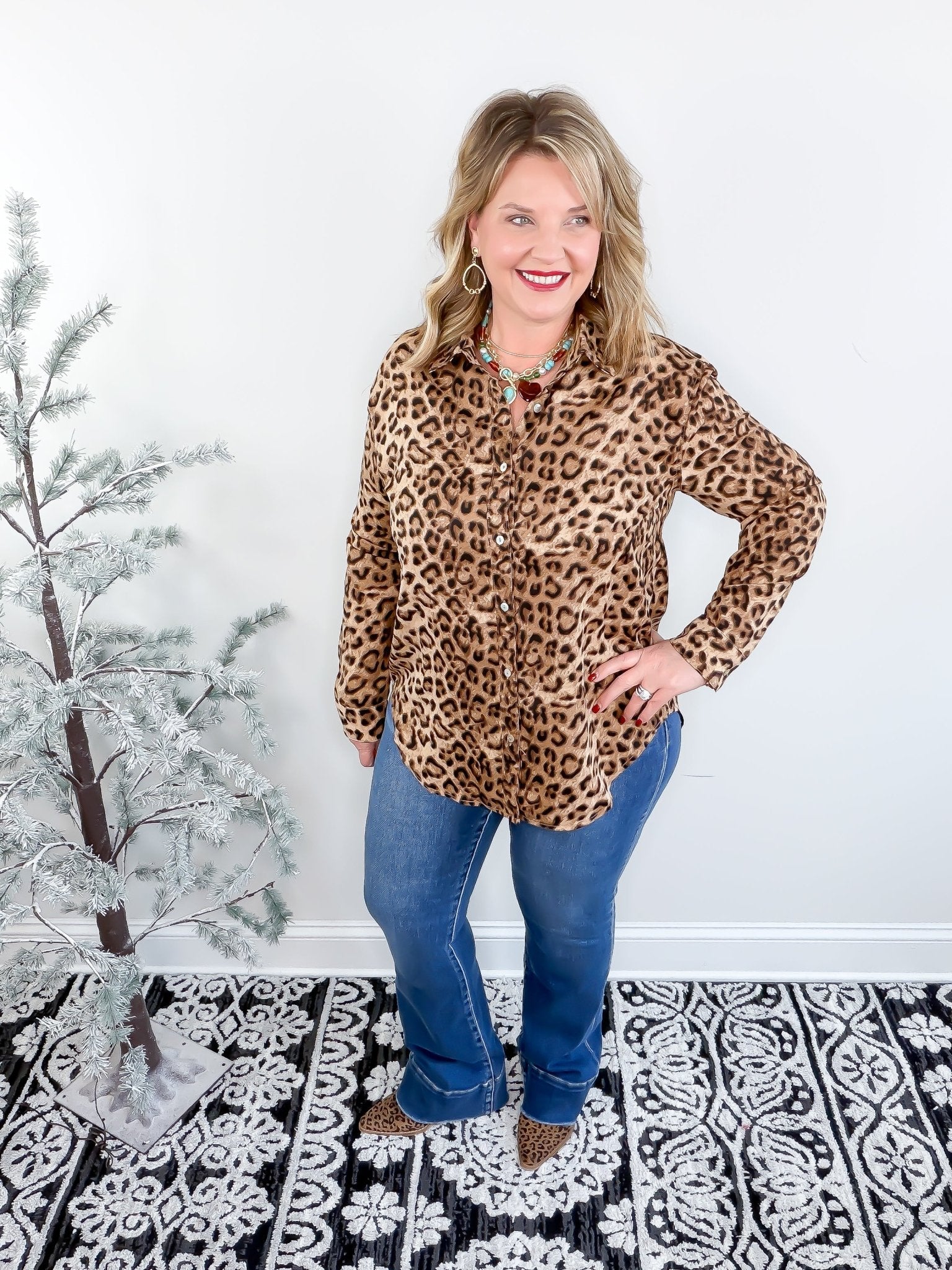 Unleash your bold side with the Wild Luxe Button-Up Shirt! Featuring a fierce leopard print and classic button-down design, this long-sleeve shirt effortlessly combines wild style with everyday comfort. Perfect for making a statement whether you're dressing up or down, it's your go-to for adding a touch of playful confidence to any outfit.