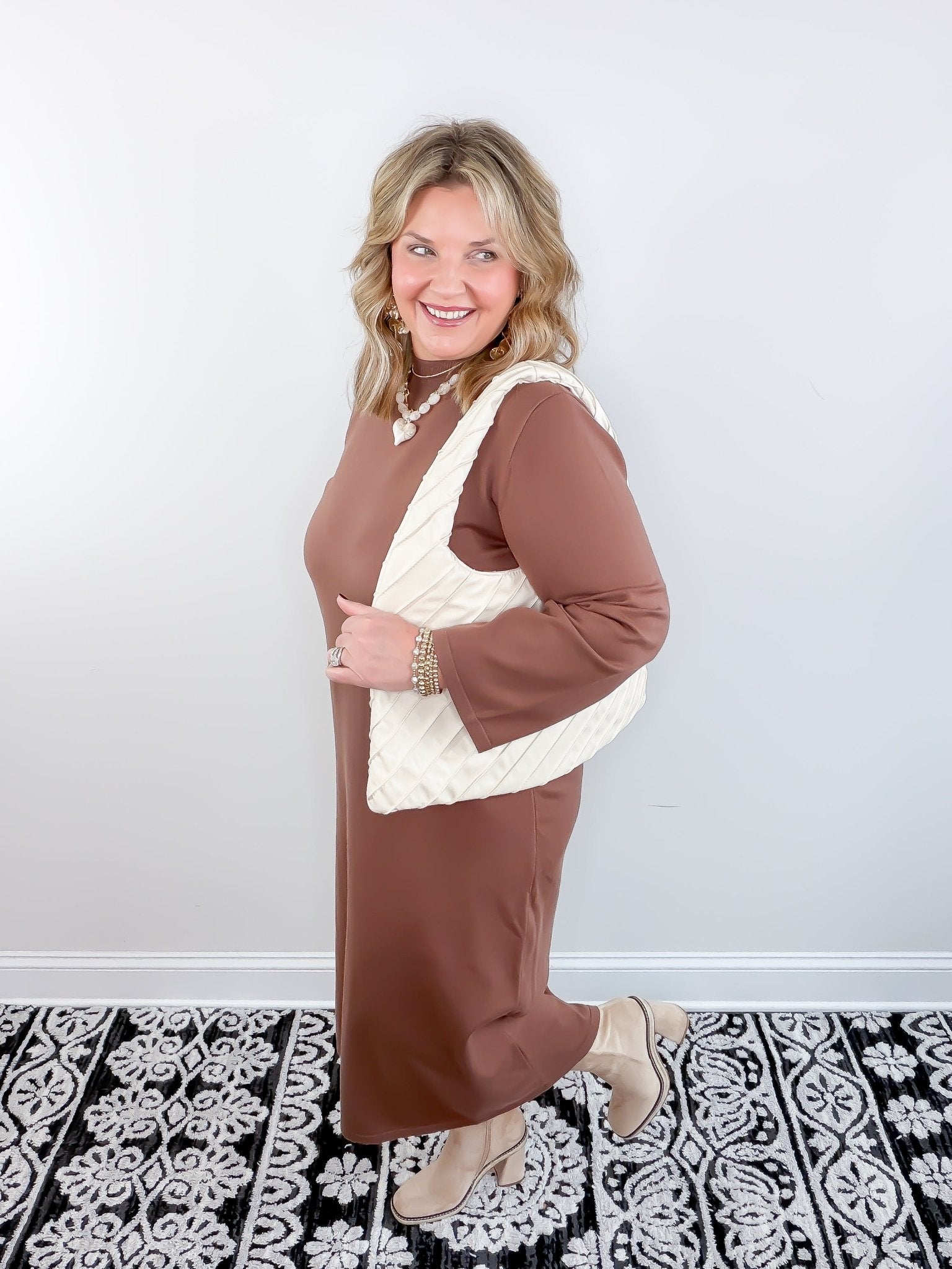 Step into effortless style with the Timeless Ease Midi Dress. This solid knit dress features a cozy mock neck and long sleeves, perfect for cooler days. Its medium-weight fabric is non-sheer, offering comfortable coverage without the need for lining. Whether you're dressing up or down, this midi length piece brings playful sophistication to your wardrobe with ease.