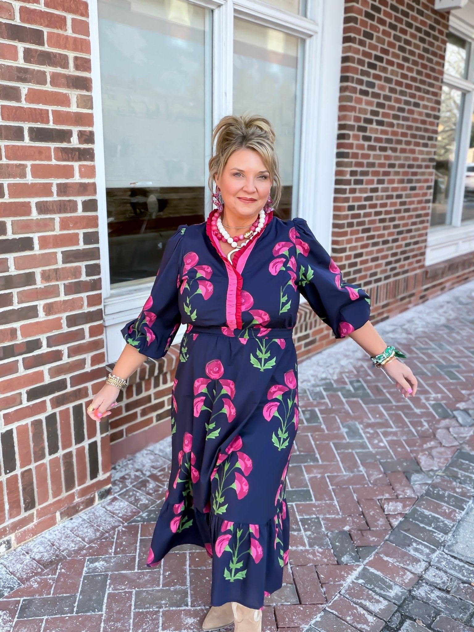The Bloomline Midi Dress shines with a playful vibe thanks to its flattering V-neckline and charming contrasting ruffle trim. The 3/4 balloon sleeves add a whimsical touch, while the elastic waist gently shapes your figure for all-day comfort. Flowing into a tiered midi skirt, this dress moves beautifully with every step. Perfect for sunny days and cheerful occasions, its lightweight, unlined design keeps you feeling breezy and bright.