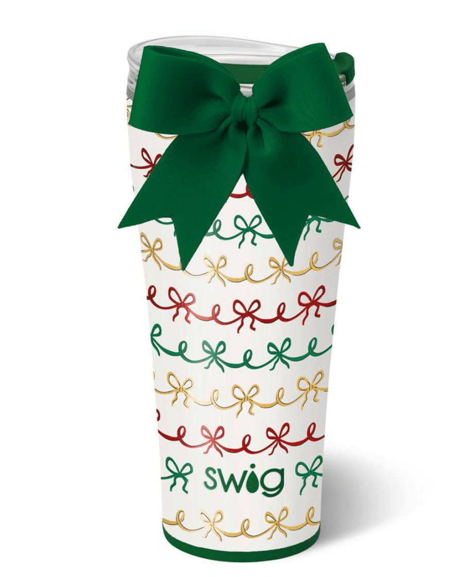 Bigger really is better! 💯 Get wrapped up in traditional holiday charm with red, green, and gold metallic bows on a glitter ivory background. A removable charming bow adorns each item like a gift. 🎀