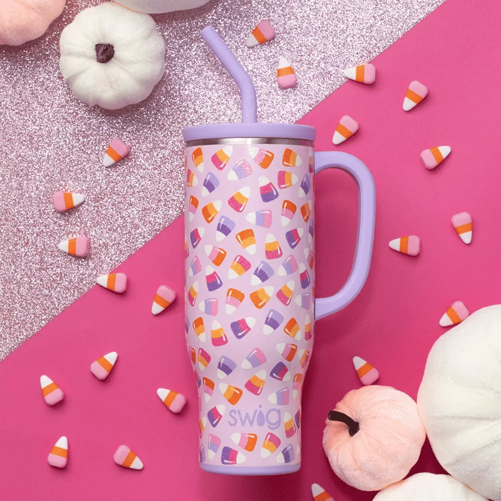 Mega sips, mega chill! 🧊 Bite into something sweet this Halloween with this glitter glow in the dark candy corn on a glitter pink background.