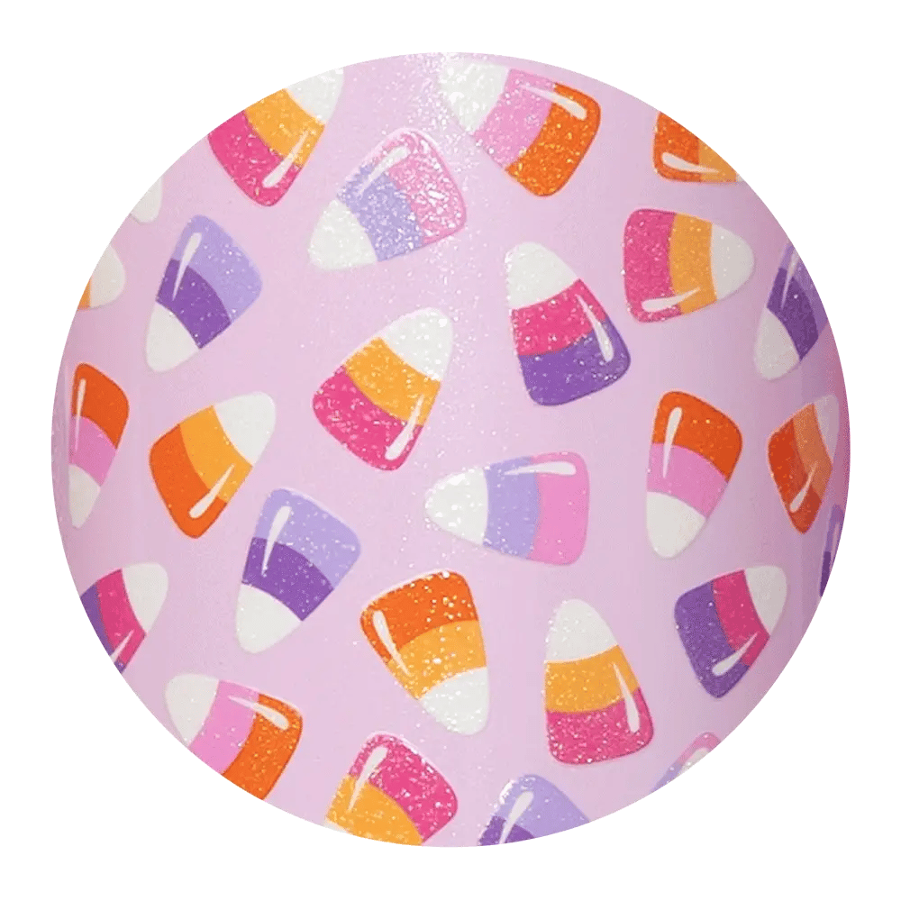 Bigger really is better! 💯 Bite into something sweet this Halloween with this glitter glow in the dark candy corn on a glitter pink background.