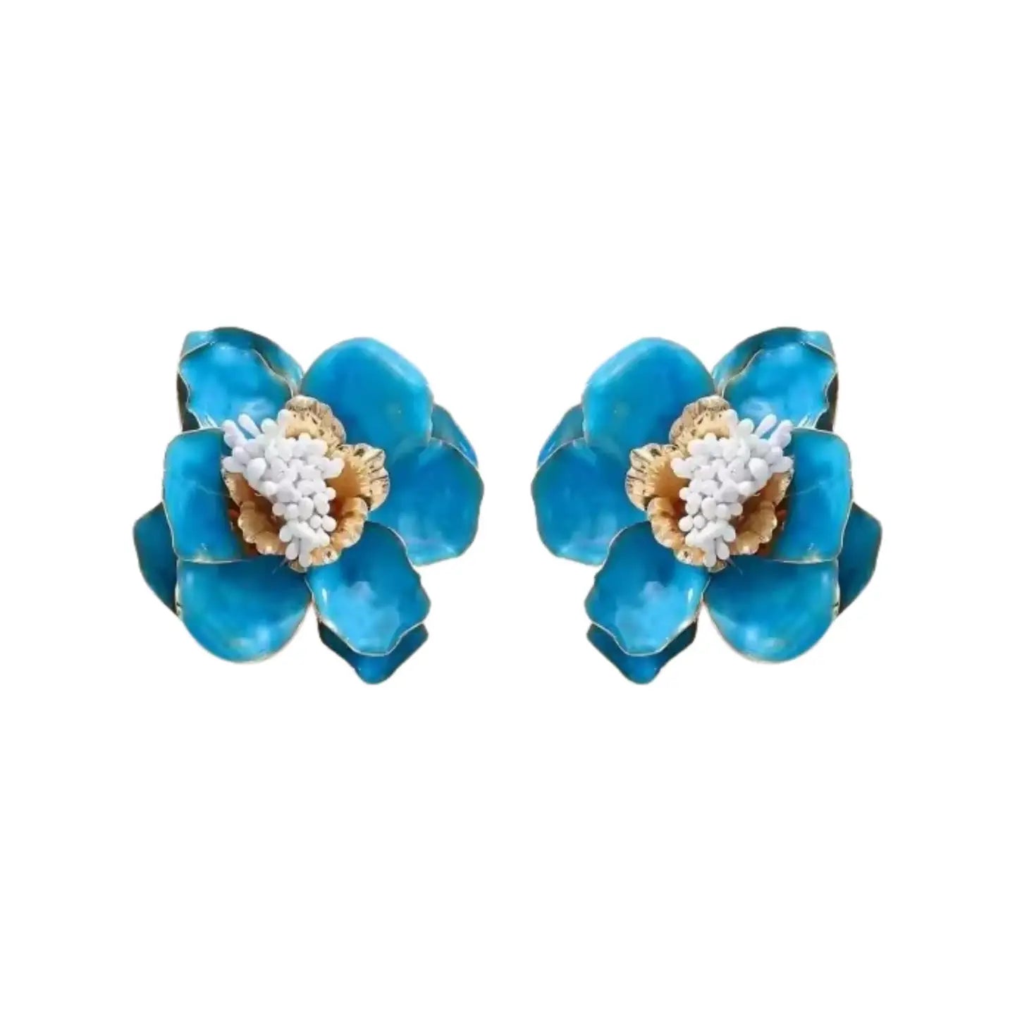 The Blossom Statement Earrings - Blue feature a stunning blue flower design with a white beaded center, offering a vibrant and feminine look. At 2.5 inches in length, these earrings are perfect for making a bold statement while maintaining a soft, floral elegance. Ideal for adding a pop of color to any outfit.