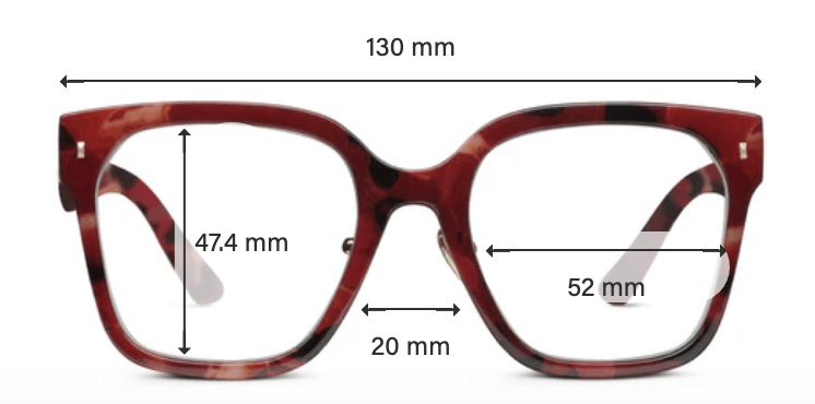 Frame Width: 130 mm (5.1 in), B Measurement: 47.4 mm (1.9 in), Eye Size: 52 mm (2.0 in), Nose Bridge: 20 mm (0.8 in)