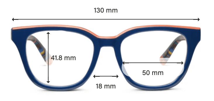Frame Width: 130 mm (5.1 in), B Measurement: 41.8 mm (1.6 in), Eye Size: 50 mm (1.9 in), Nose Bridge: 18 mm (0.7 in)