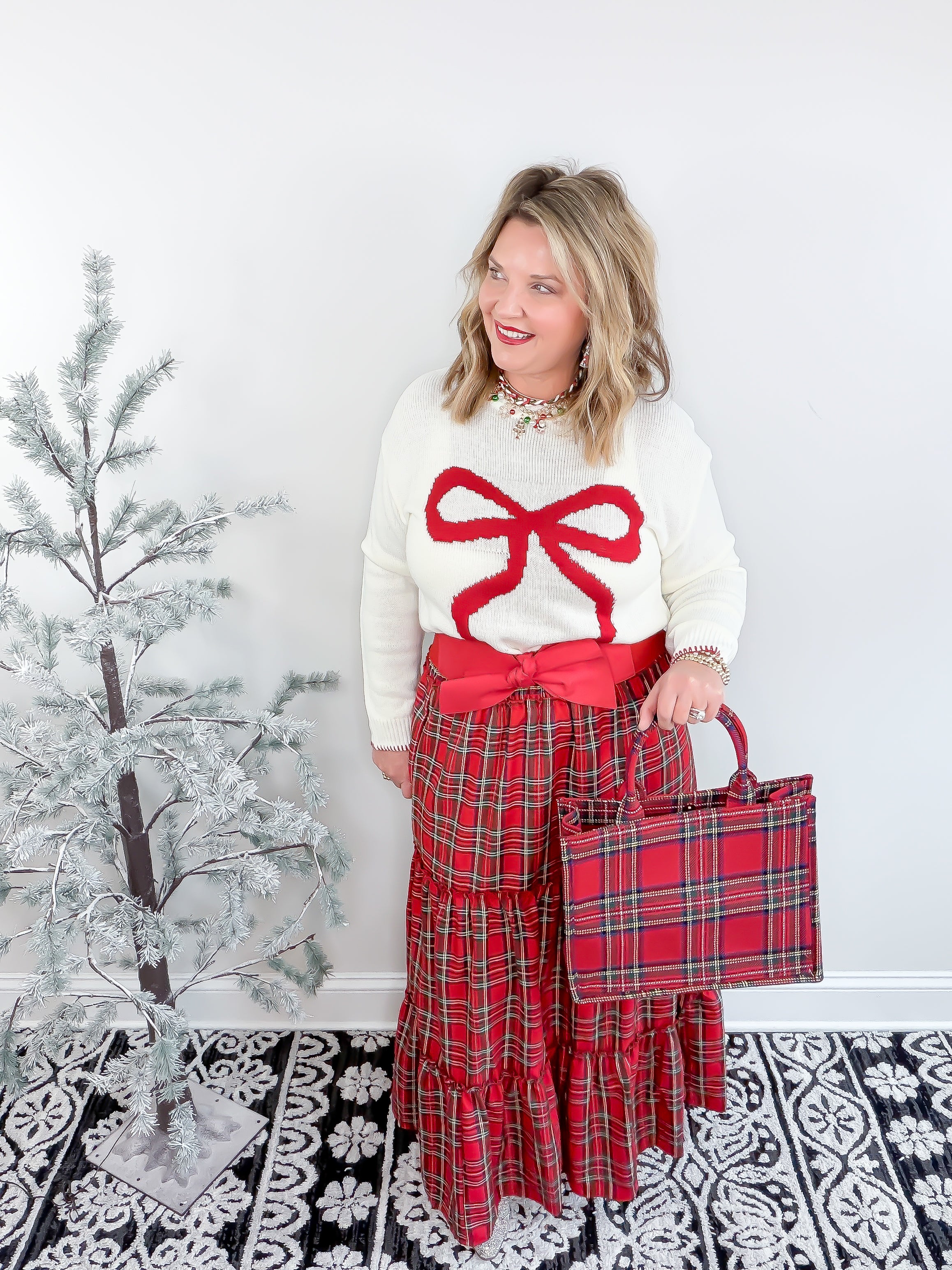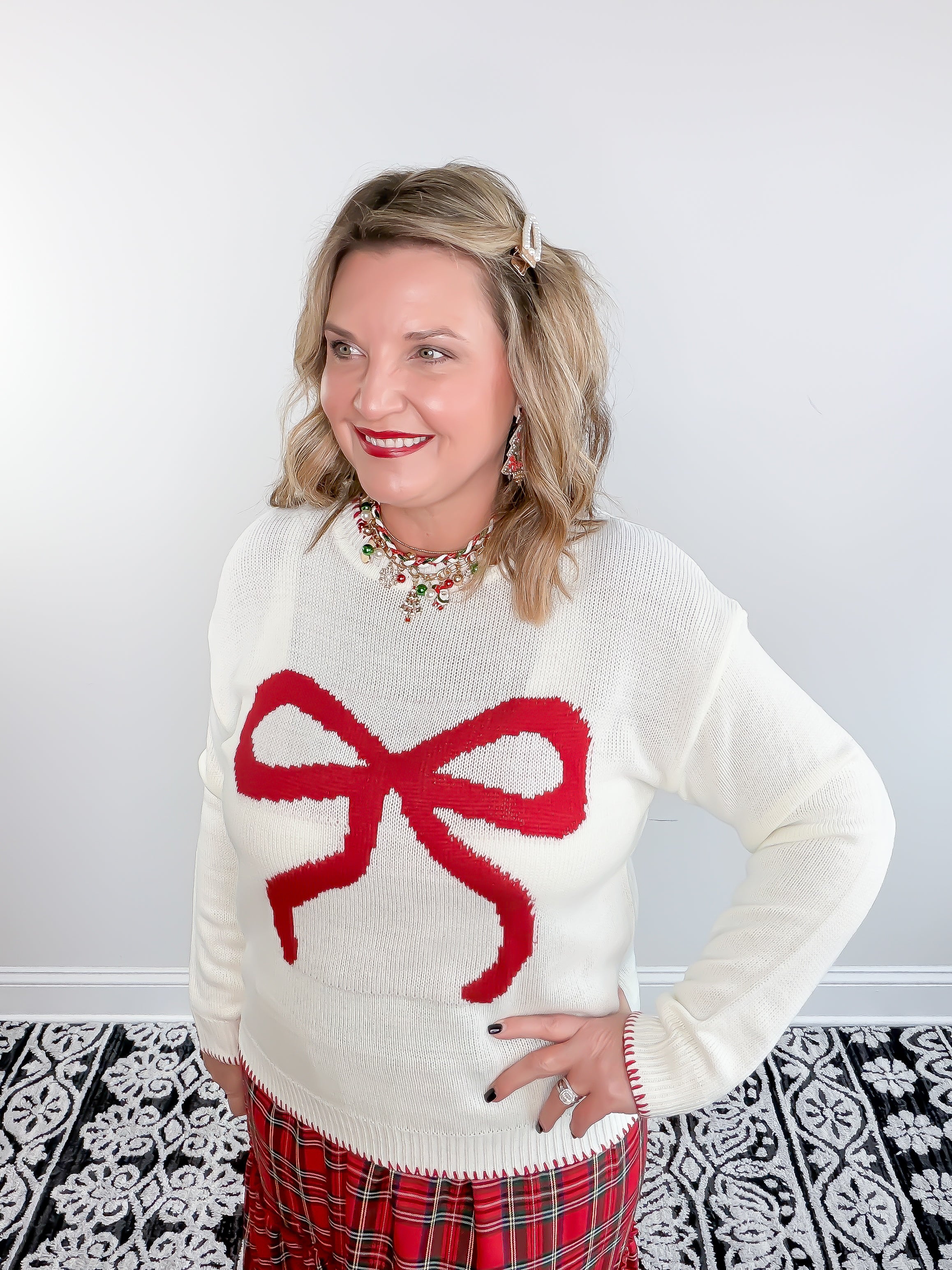 Cozy meets cute in the Wrapped Up In Style Sweater featuring a charming bow graphic that wraps you in style and warmth. Perfect for lounging or layering, it's soft to the touch and sure to brighten your day with a fun, fashionable twist.