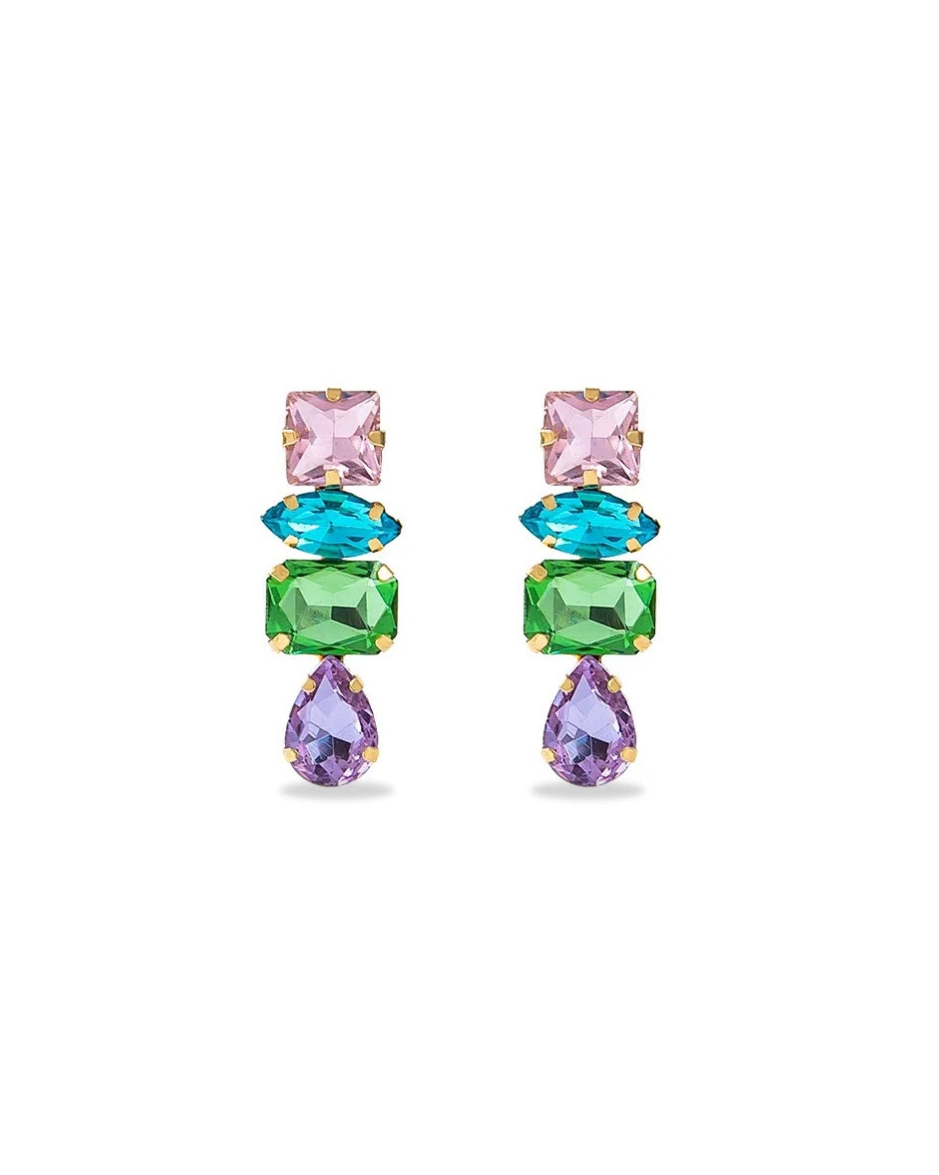 Turn heads with the vibrant Juniper Statement Earrings. Measuring 1.75 inches, they showcase a lively blend of pink, blue, green, and purple glass stones. Their colorful and fun design brings a splash of elegance and whimsy to any look, perfect for adding flair to casual days or dressing up for special moments. These earrings are a playful way to express your unique style and brighten up your accessory game.
