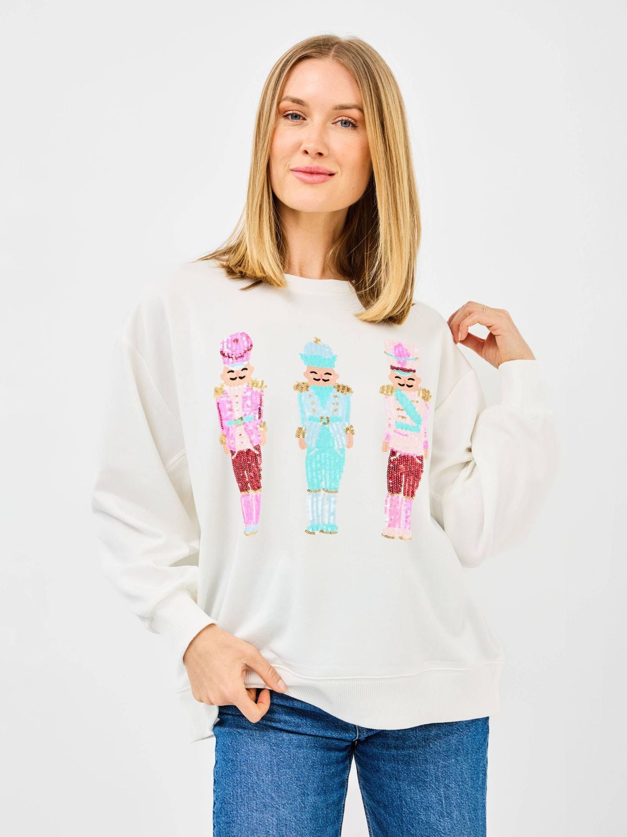 Celebrate the season in style with our Nutcracker Trio Sweatshirt! Featuring a festive Christmas sequin nutcracker design, this soft and cozy sweatshirt brings holiday cheer to your wardrobe. Perfect for cozy nights by the fire or playful holiday gatherings, its shimmering sequins add just the right sparkle to your festive look. Stay comfy, look merry, and let the Nutcracker trio brighten your holiday spirit!
