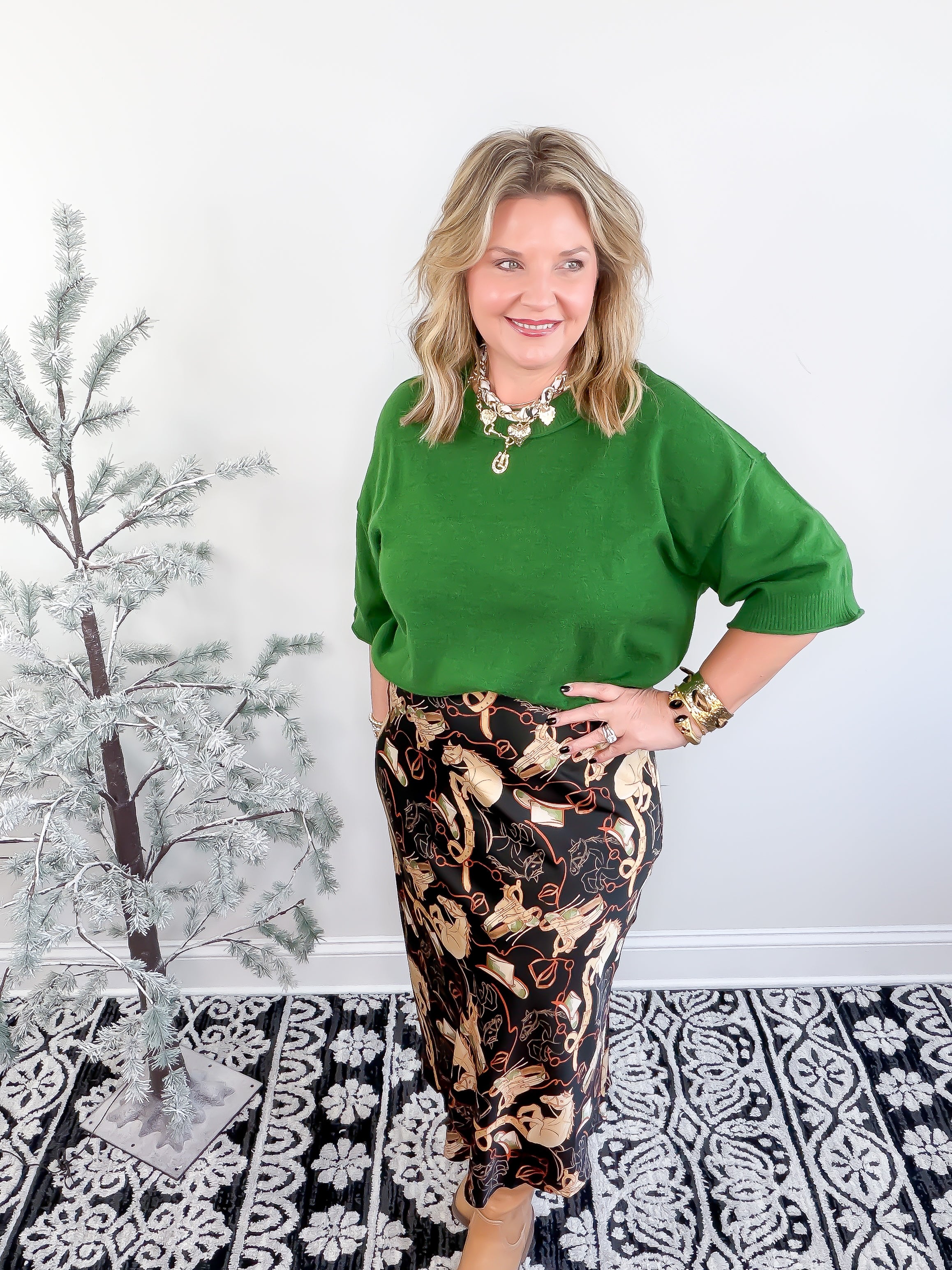 The Dusty Trails Skirt brings a playful twist to western style with its satin-effect fabric featuring a bold print. Designed for a flattering high-waisted fit, this midi-length skirt glides effortlessly while the covered elastic waistband ensures all-day comfort. Perfect for adding a little adventure to your everyday look.