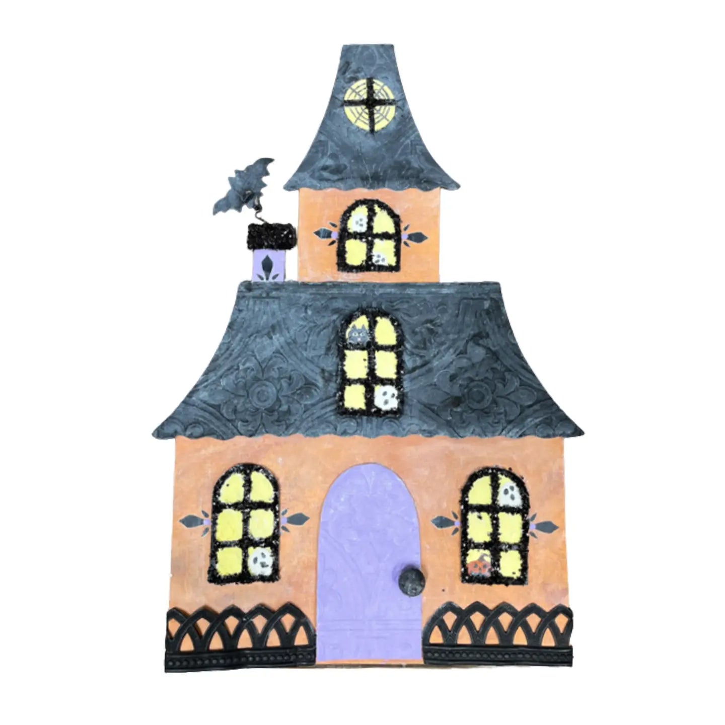 Complete your Halloween décor with a festive Halloween house topper, designed to sit perfectly atop your display. This charming and spooky topper features elements like haunted houses, bats, pumpkins, and ghosts, capturing the essence of Halloween in a fun and unique way. Ideal for your welcome boards or wood bases, it brings a playful yet eerie atmosphere to your home, setting the stage for a spooky season. Perfect for Halloween enthusiasts, this topper is a great way to add a festive touch to your décor and welcome trick-or-treaters with a touch of seasonal magic.