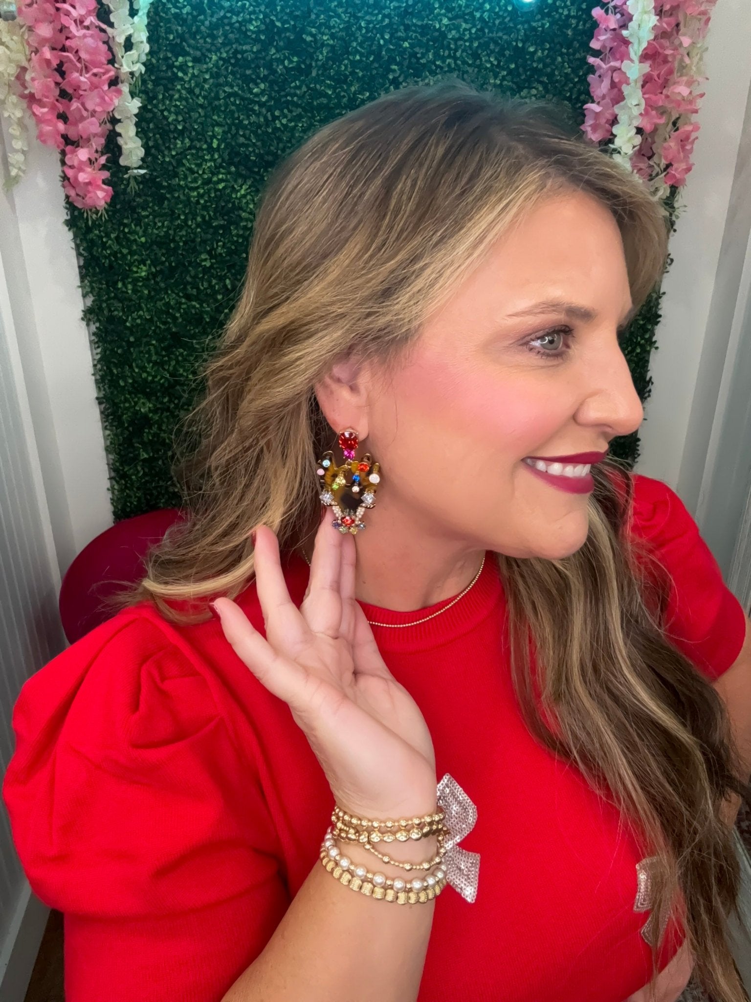 Be Santa's fanciest reindeer in this embellished earring. It has an acrylic base with accent stones and pearls on a post back.