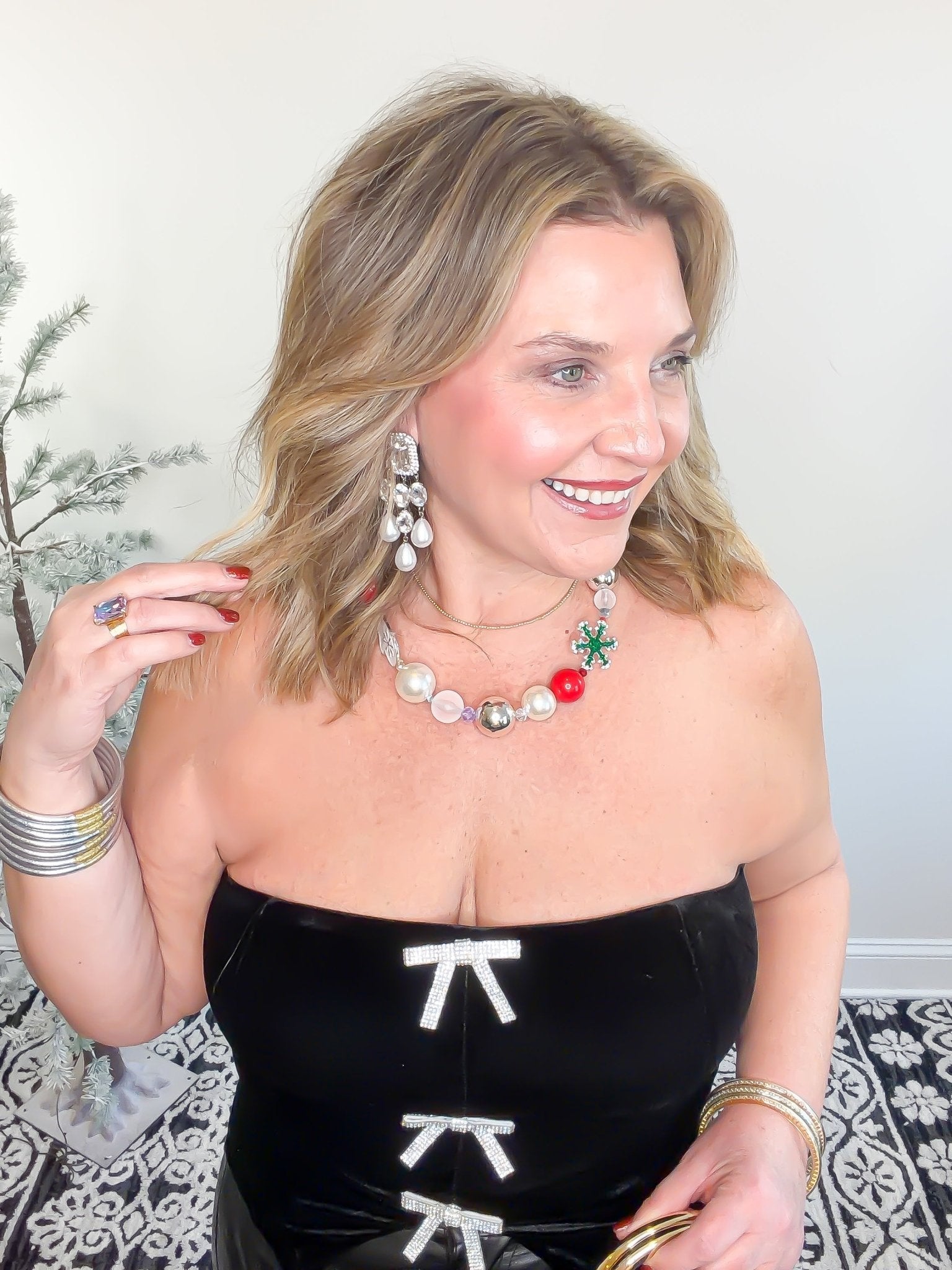 Turn heads this holiday season with the Velvet & Vixen Top, featuring a plush velvet finish and sparkling rhinestone bows that add just the right amount of festive flair. This tube top fits snugly for an effortlessly chic look, perfect for dancing the night away or cozying up by the fire. Embrace your playful side and make your Christmas celebrations shine bright in this glamorous statement piece.