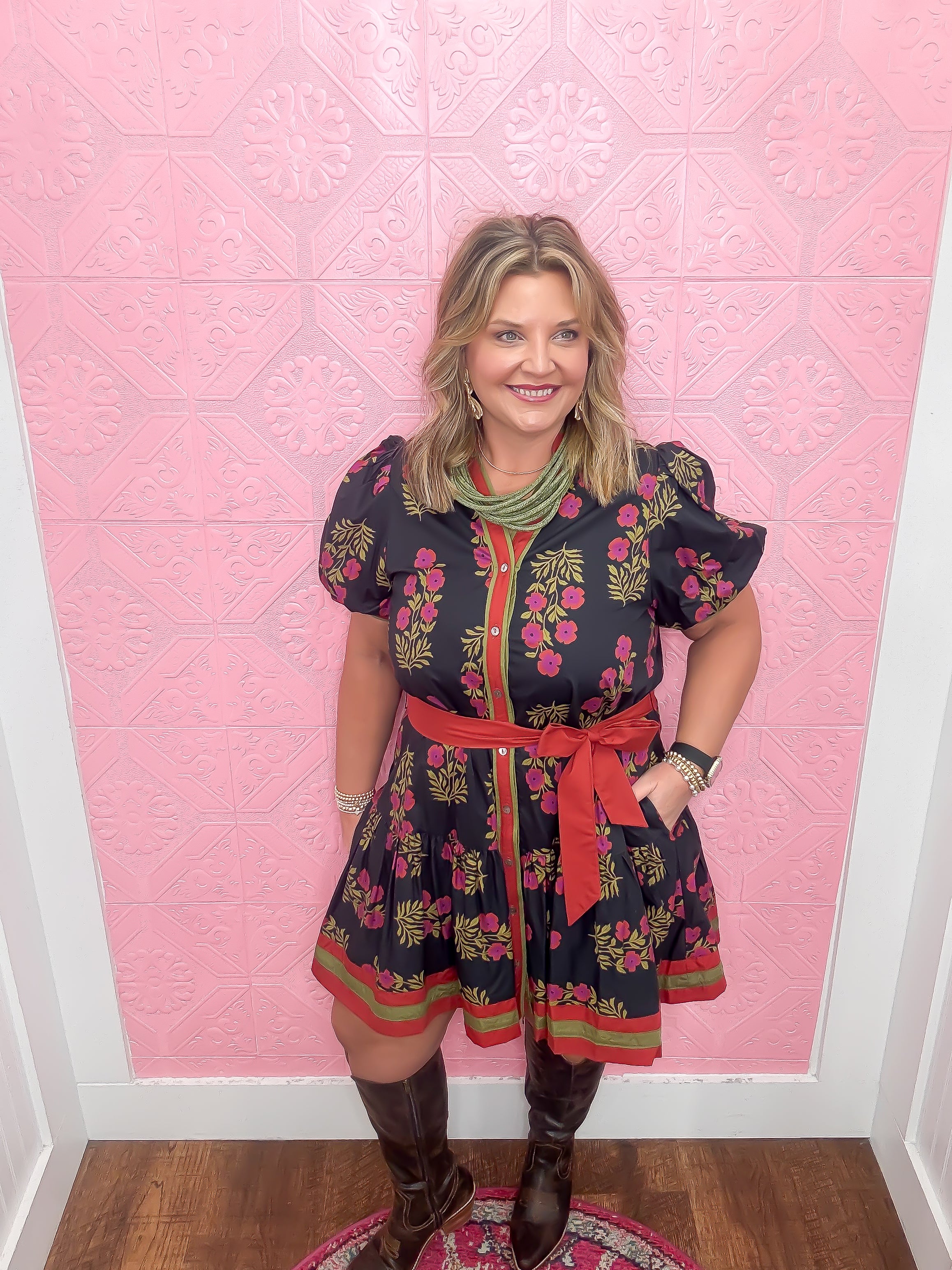 Step into the spotlight with the Wildflower After Dark Mini Dress! This playful piece features charming short puff sleeves and a flirty ruffle hem, all accented by a vibrant multicolor band. The V-neck with a band collar and button closure adds a touch of chic, while the removable belt lets you tailor your look. Lightweight and lined for comfort, this woven dress also surprises with handy side pockets—perfect for keeping essentials close during your fun-filled nights. Embrace effortless style that dances with you wherever you go!