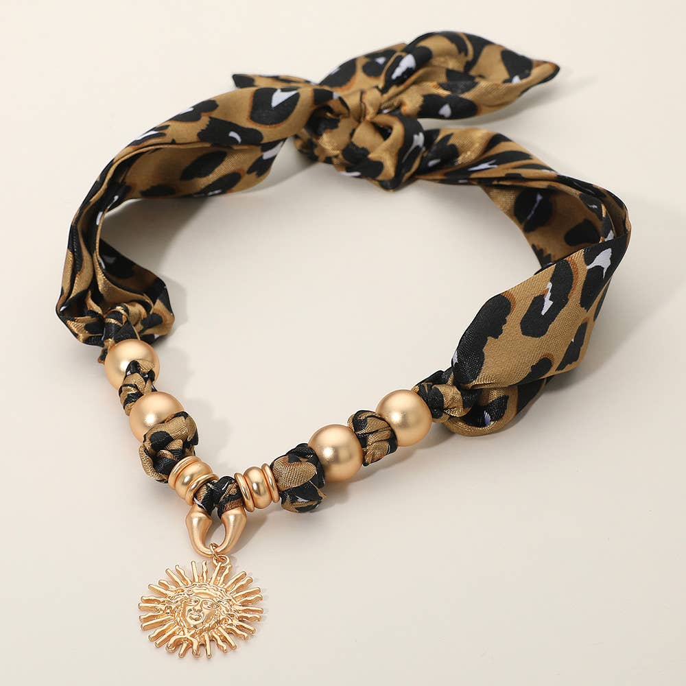 Turn heads with this eye-catching Sunburst charm necklace that brings instant personality to your style. Featuring a gorgeous leopard-patterned fabric tie paired with shimmering bead details, this playful piece adjusts to fit you perfectly. Whether you're dressing up or keeping it casual, this necklace delivers that perfect blend of fun and sophistication—the kind of accessory that makes you feel fabulous all day long.