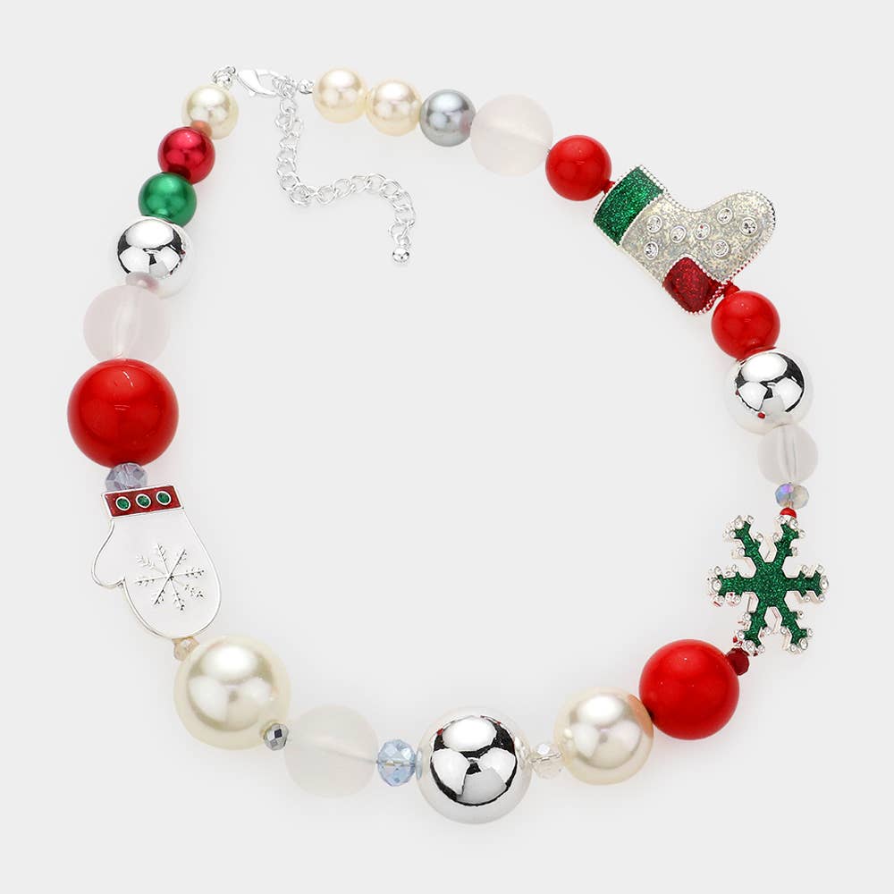 Bring festive cheer to your outfit with this Christmas Snowflake Pearl Beaded necklace and earring set. Featuring playful holiday charms like a mitten and glitter snowflake, along with shiny oversized beads, it’s a joyful accessory perfect for holiday parties and gift-giving.