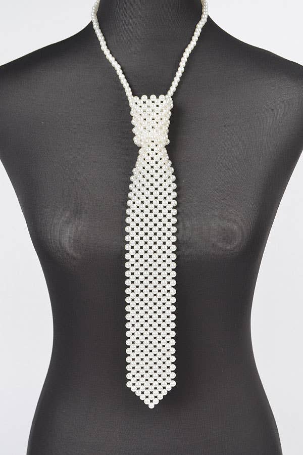 Meet the Faux Pearl Polyester Necktie Necklace—a playful blend of elegance and flair. This charming accessory combines dainty faux pearls with a trendy necktie to add a fun twist to your look. Turn heads and show off your unique style with this standout piece.
