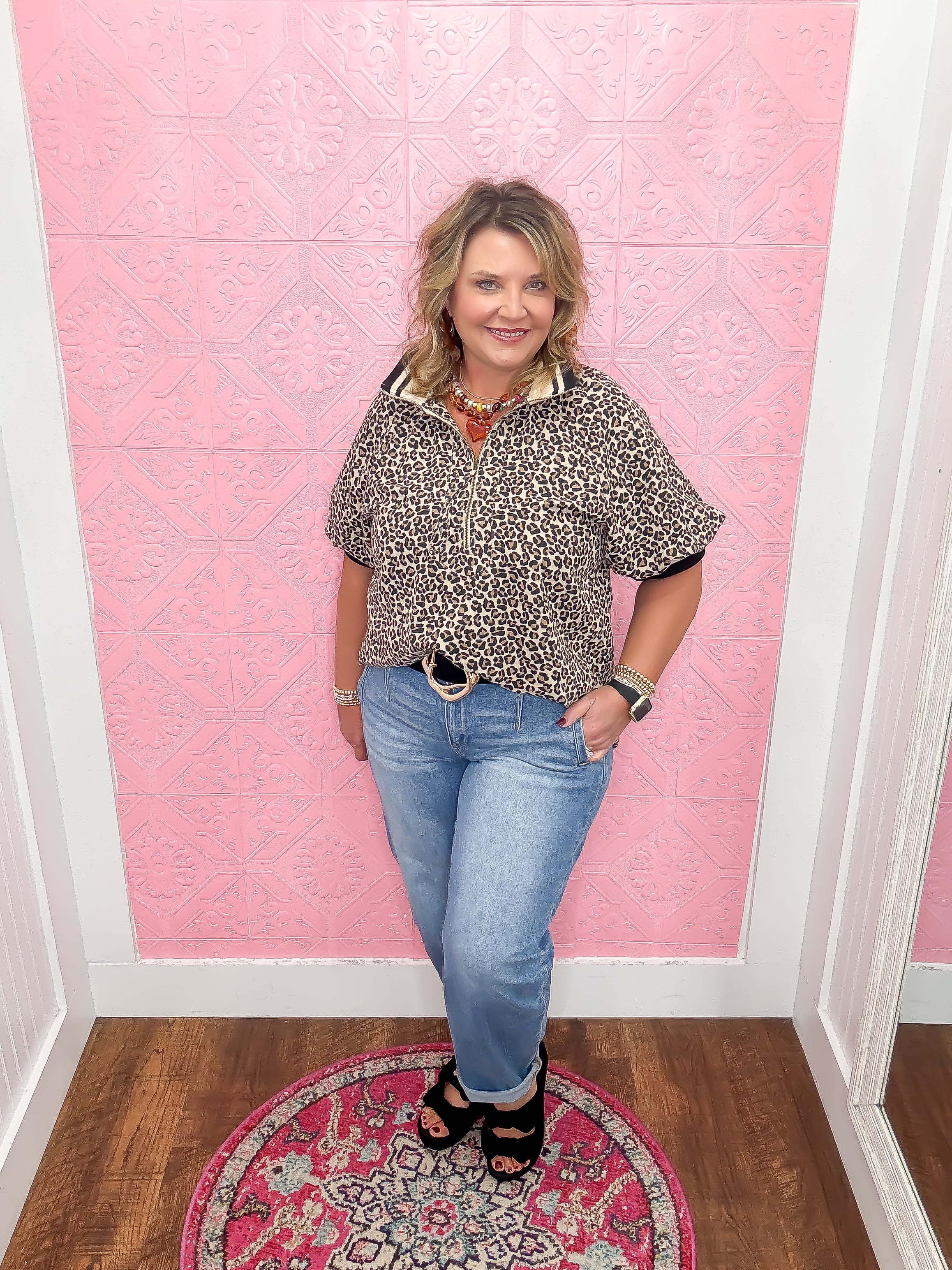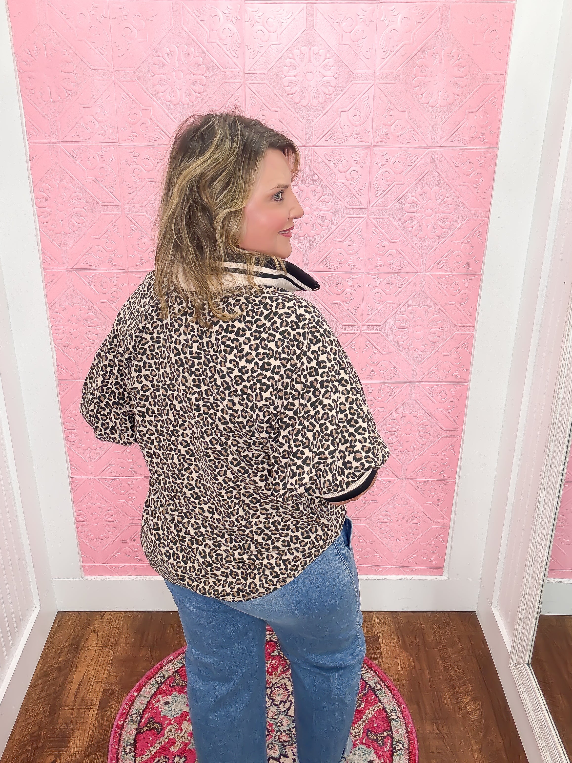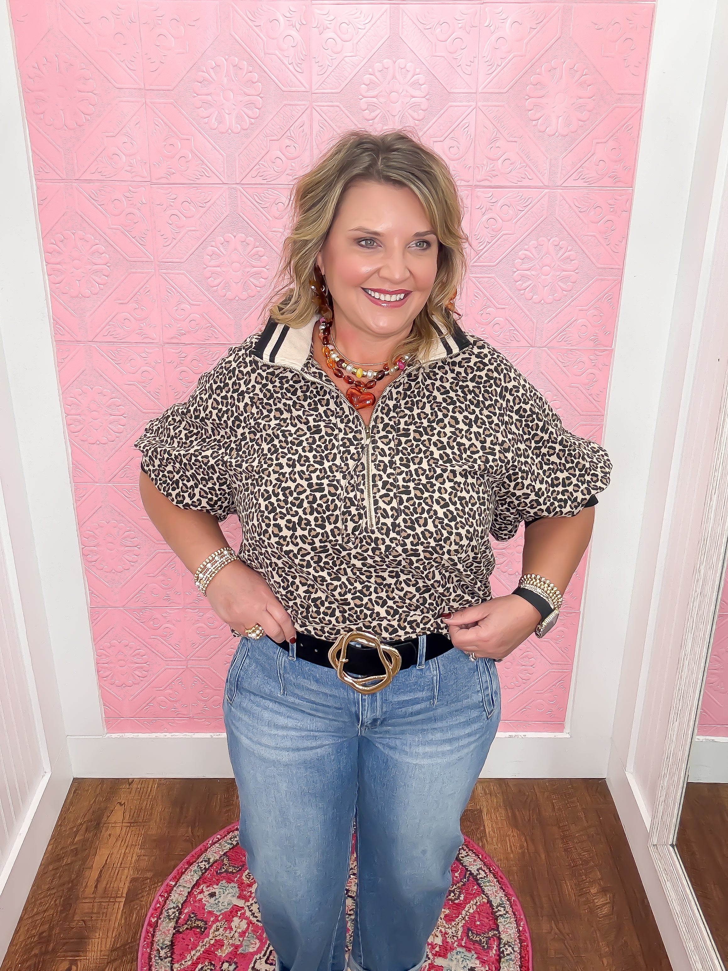 Add a wild twist to your wardrobe with the Color Me Catty Blouse! This lightweight, woven top features a fun leopard print and playful short puff sleeves. The multicolor band collar and half-zip detail bring a pop of color and personality, perfect for standing out with ease. Unlined and non-sheer, it’s comfortable and breezy for all-day wear.