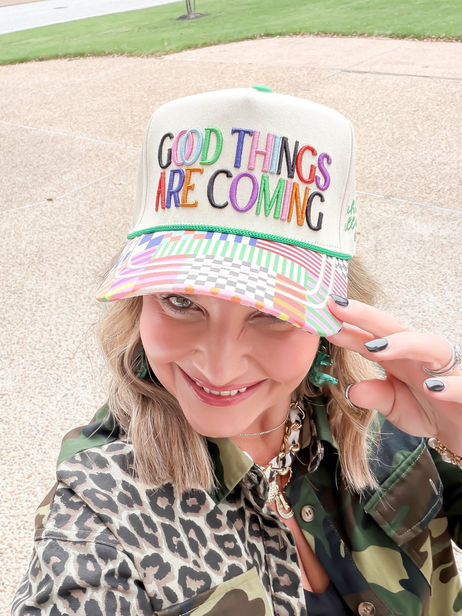 This "Good Things Are Coming" baseball cap adds a splash of optimism to any outfit. With its cheerful message and classic design, it’s perfect for brightening your day while keeping the sun out of your eyes. Comfortable and fun, wear it to spread good vibes wherever you go!