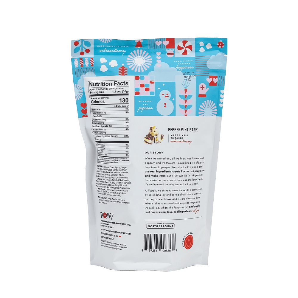 Lightly flavored peppermint popcorn layered with dark and white chocolatey drizzle, then sprinkled with all-natural crushed peppermint candies for the ultimate holiday treat