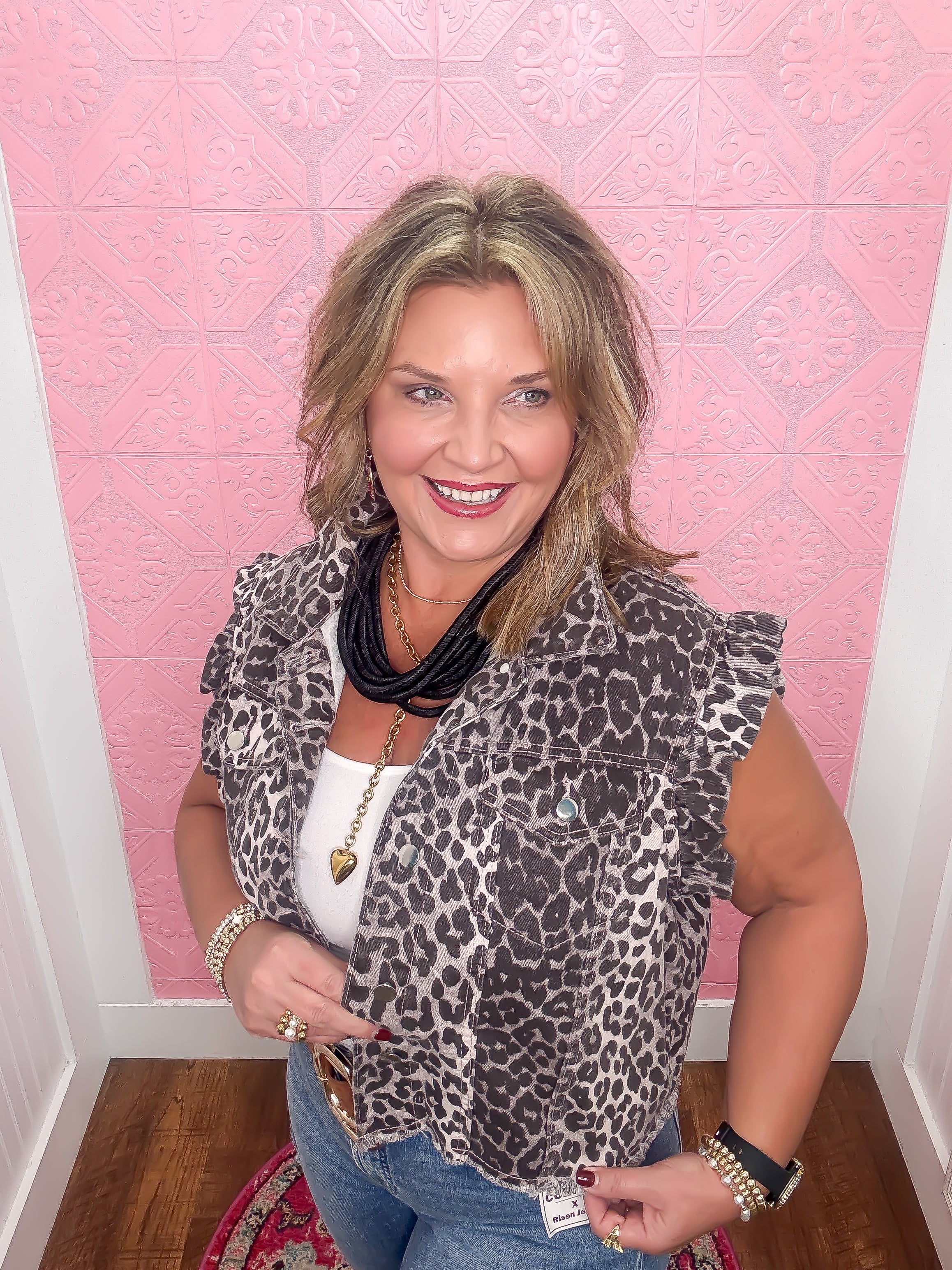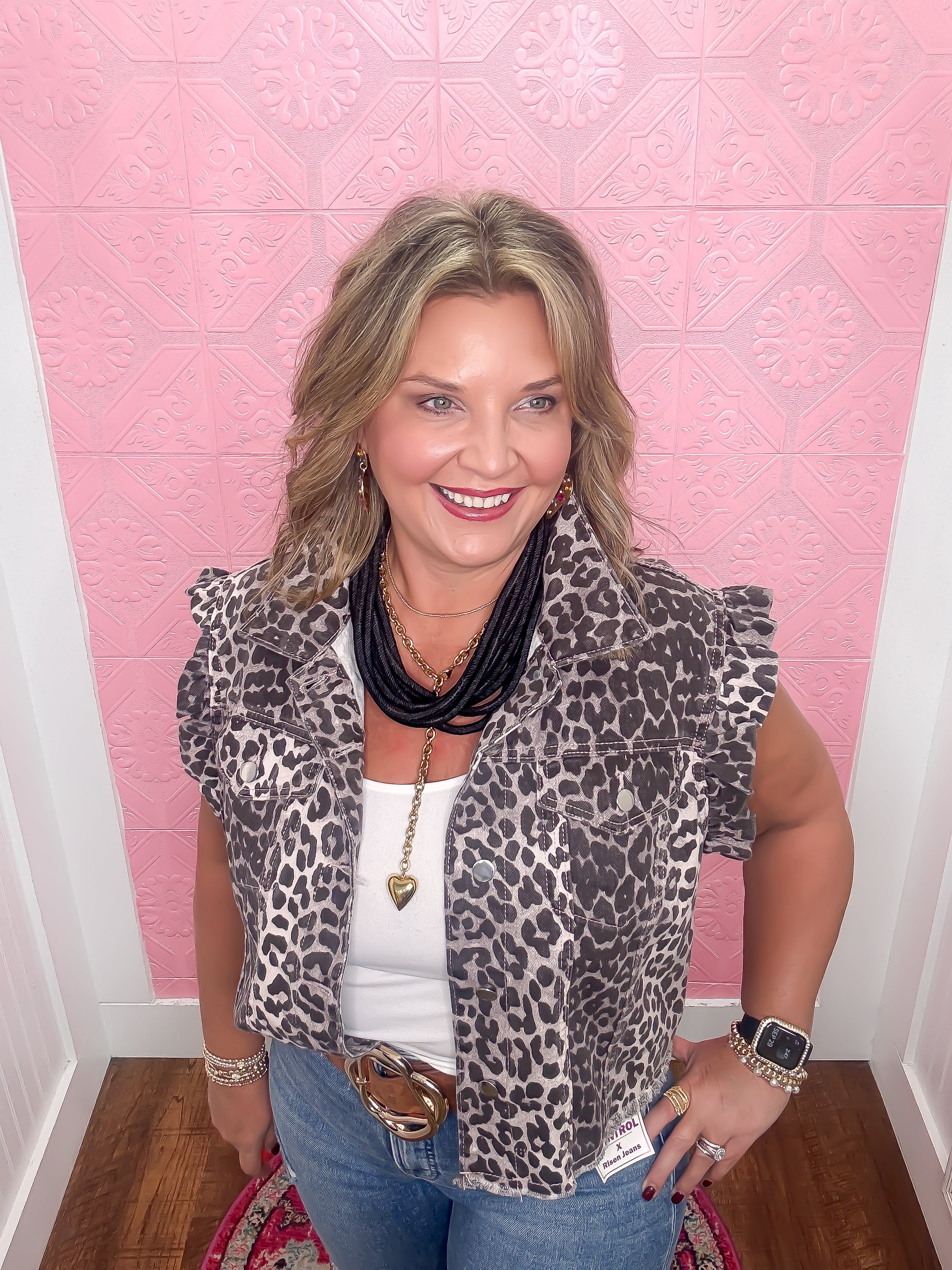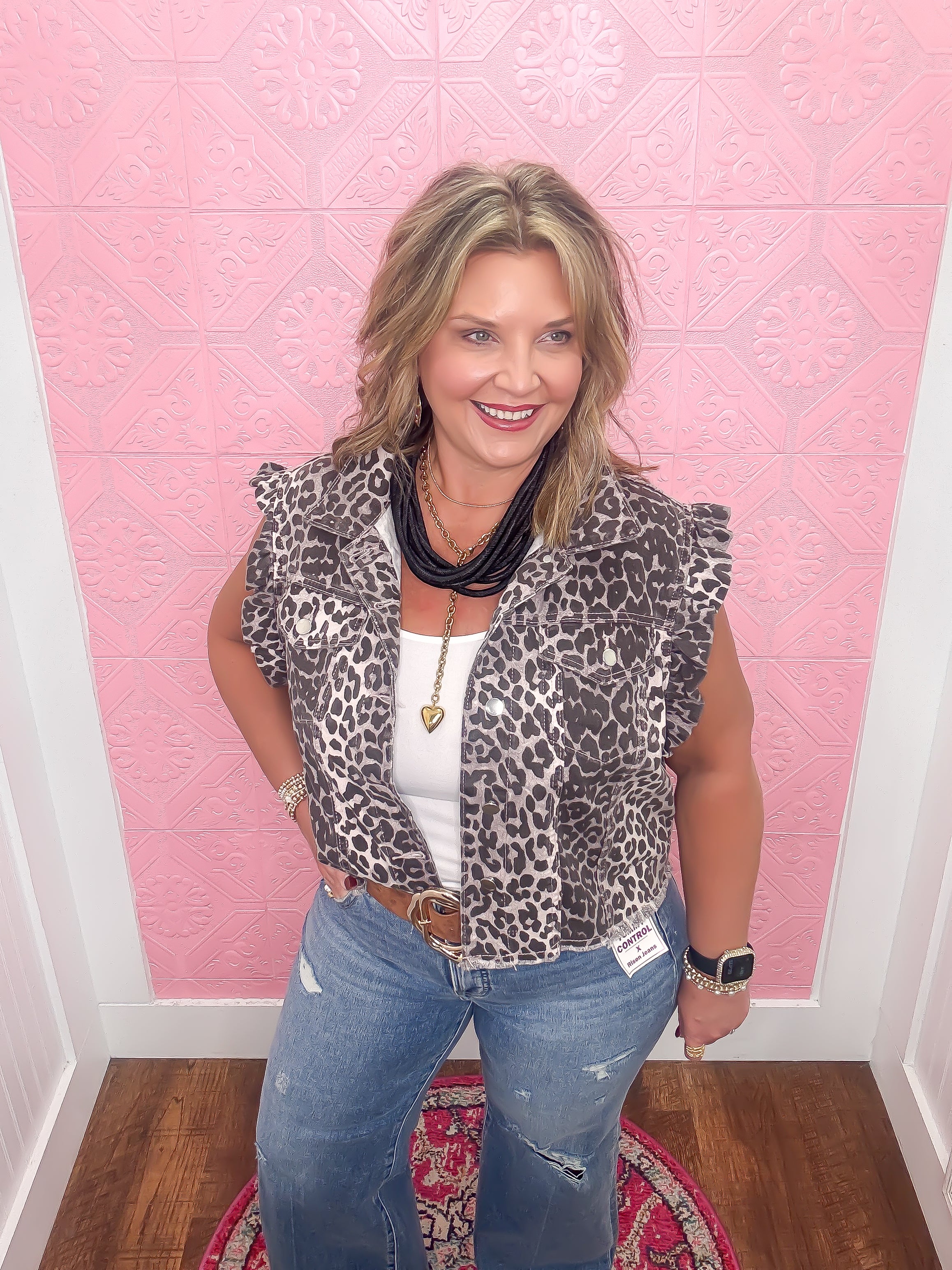 Unleash your wild side with our Spotted Sass Vest! This eye-catching leopard print denim vest features playful ruffled sleeves that add just the right amount of flair to your outfit. Perfect for layering over tees or dresses, this versatile piece brings fun, fearless fashion to your everyday wardrobe.