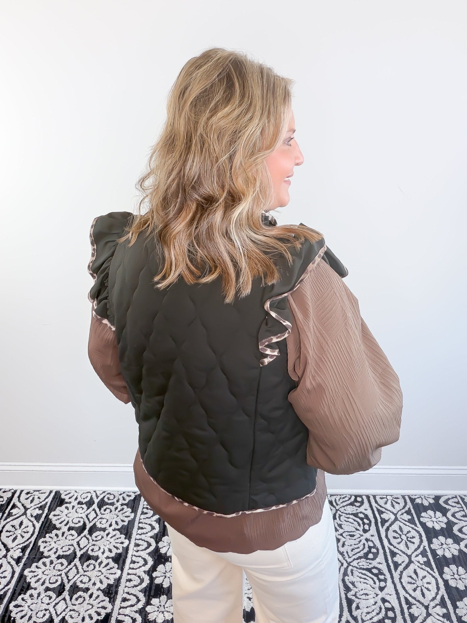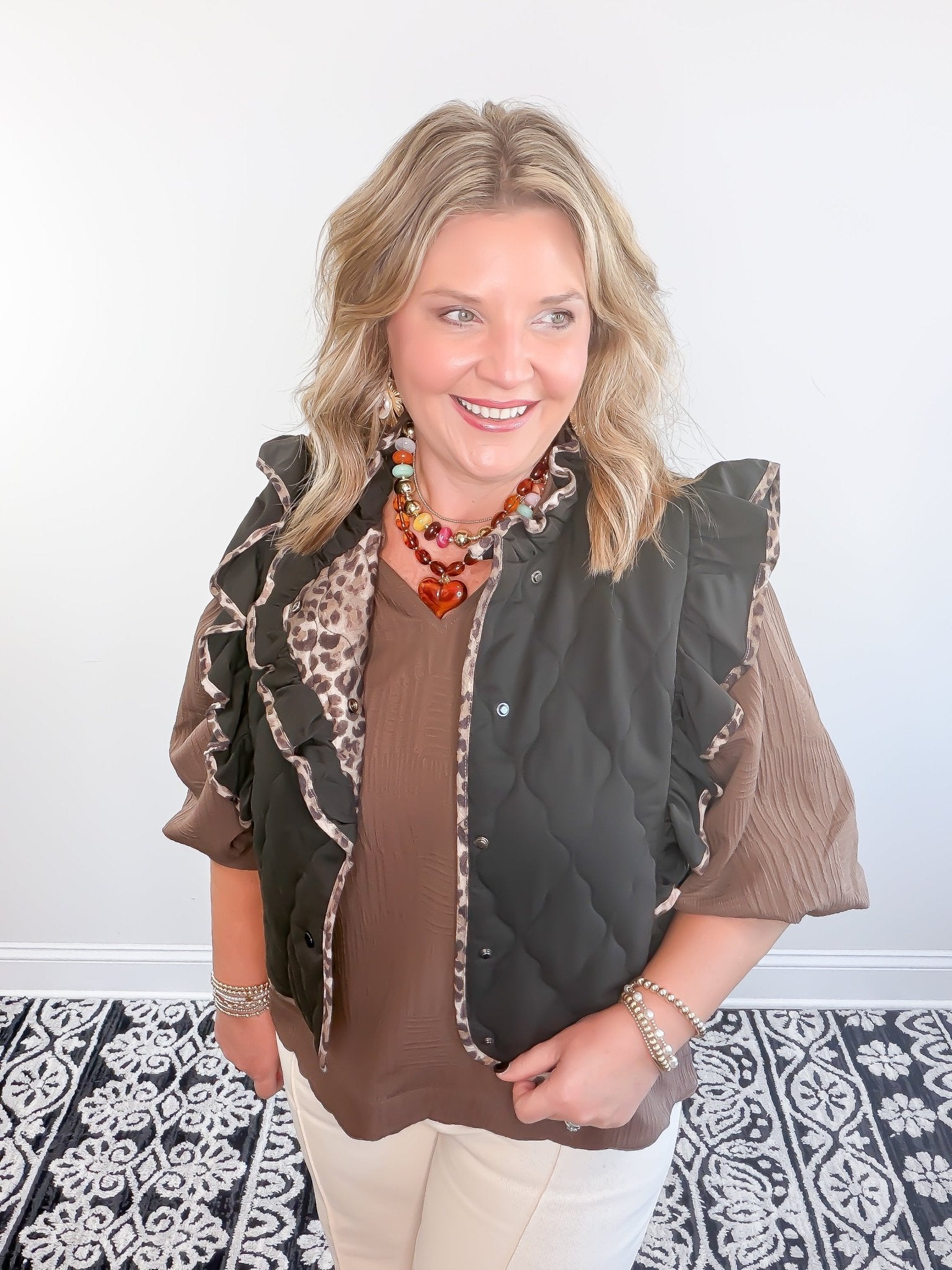 Add a wild twist to your layering with The Untamed Quilted Vest! Featuring a snap button front and a cozy high collar, this sleeveless vest boasts playful ruffle shoulders and striking leopard trim for a fun, fierce look. With handy side slip pockets and a soft lined interior, it’s the perfect mix of style and comfort to elevate any outfit. Embrace your untamed side while staying warm and chic!
