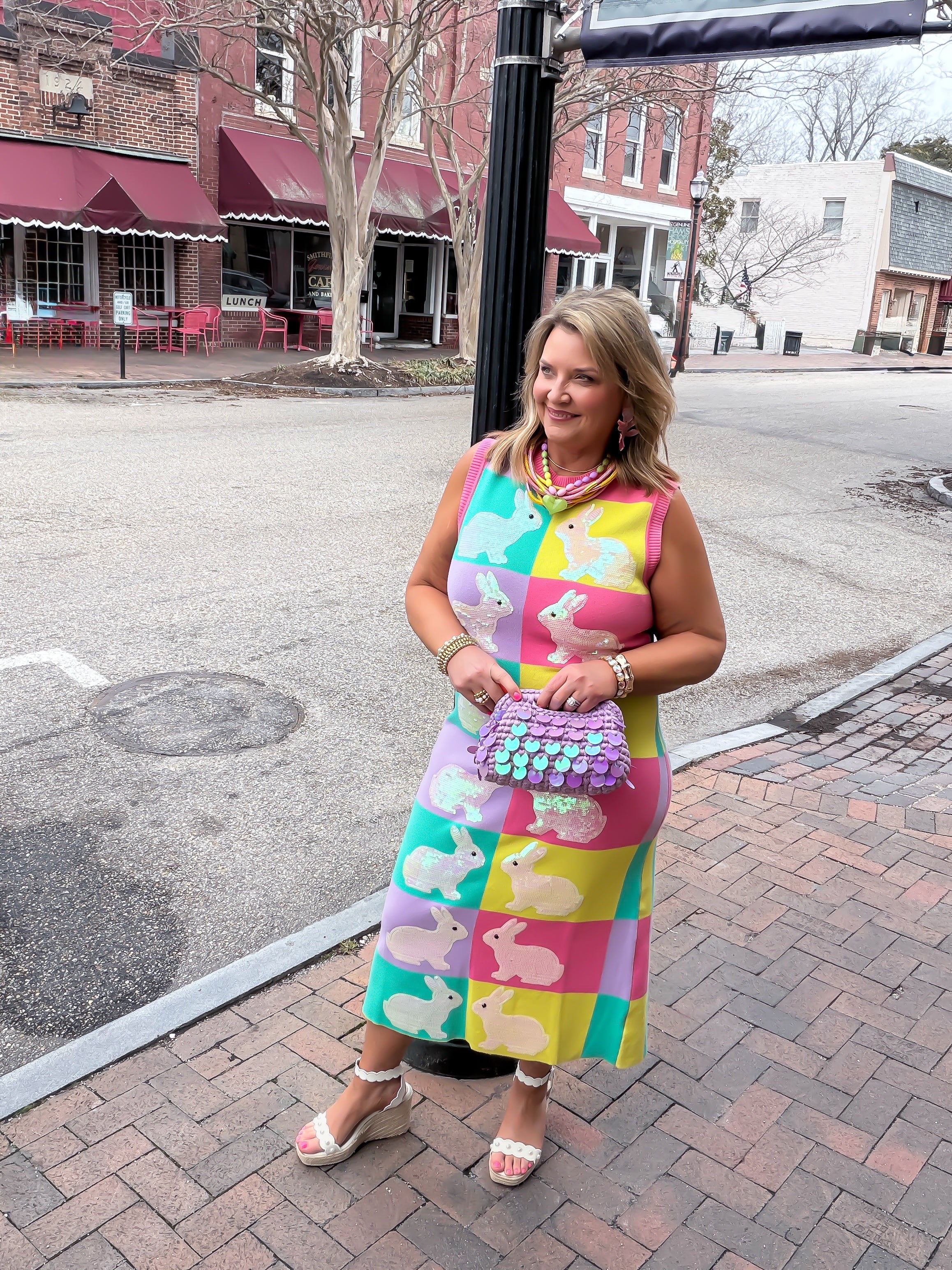 Radiate festive charm in this luxurious Queen of Sparkles Checkered Easter Bunny knit masterpiece featuring whimsical bunny patterns and a vibrant pastel palette. Perfect for Easter brunch or spring celebrations, this statement piece combines high-end boutique style with effortless comfort.