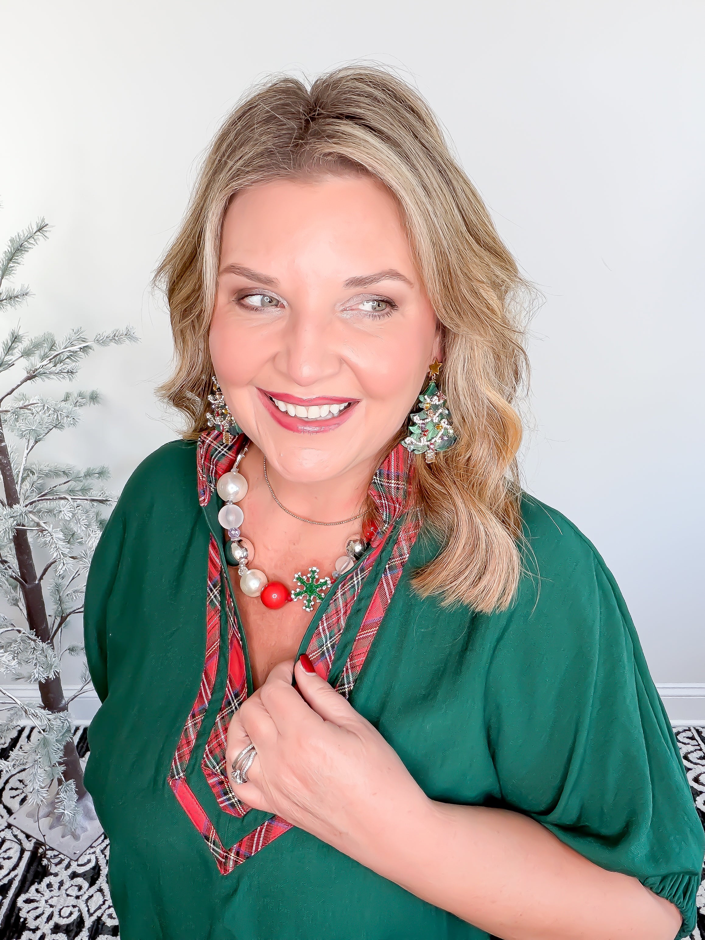 This playful Holiday Contrast Blouse mixes cozy plaid with a breezy, lightweight feel. Featuring a short sleeve dolman cut and a striking high V-neck band in plaid, it adds a fun twist to your outfit. Crafted from woven fabric that's unlined and non-sheer, it’s both comfortable and effortlessly stylish for festive days or casual outings.