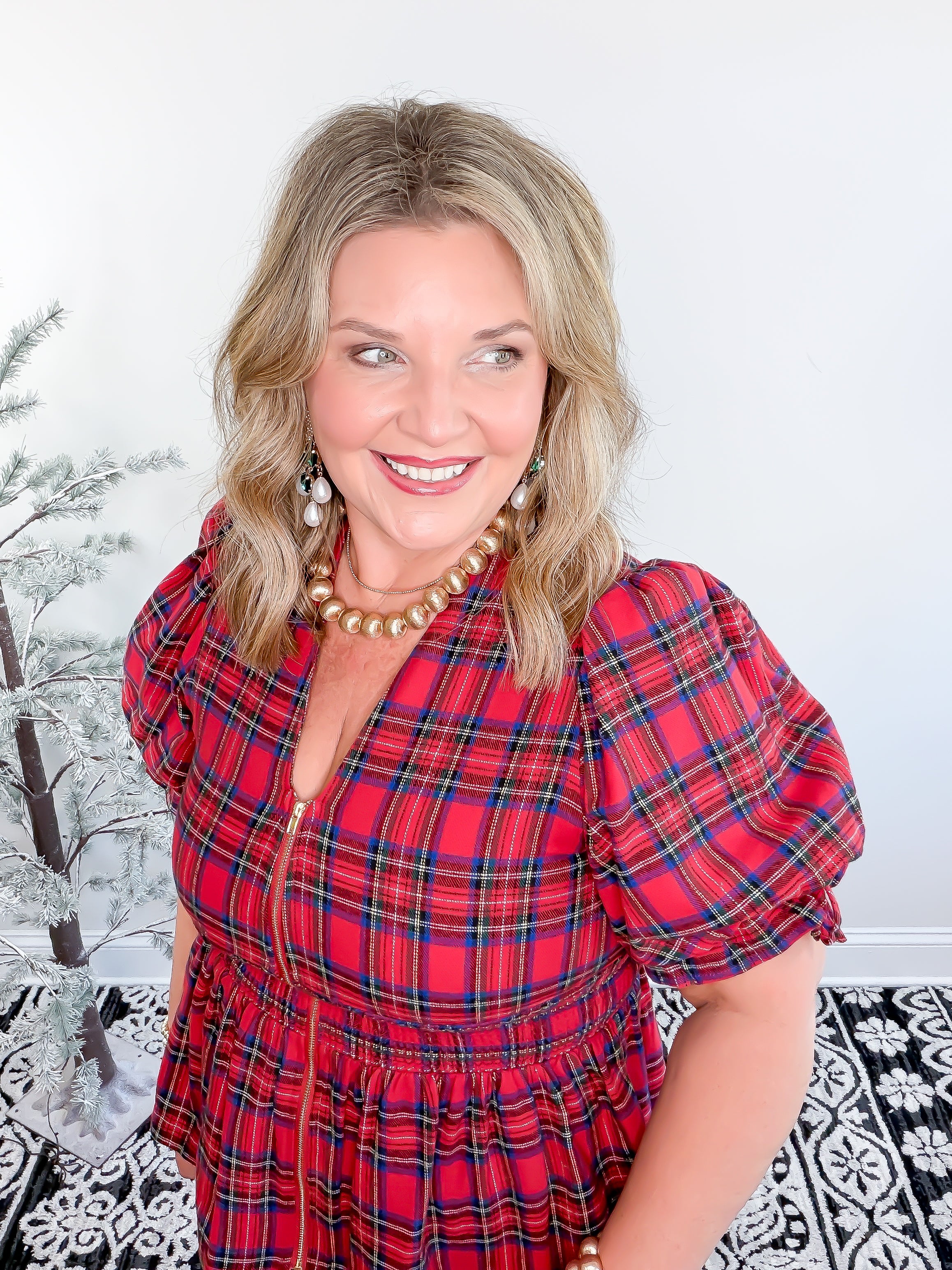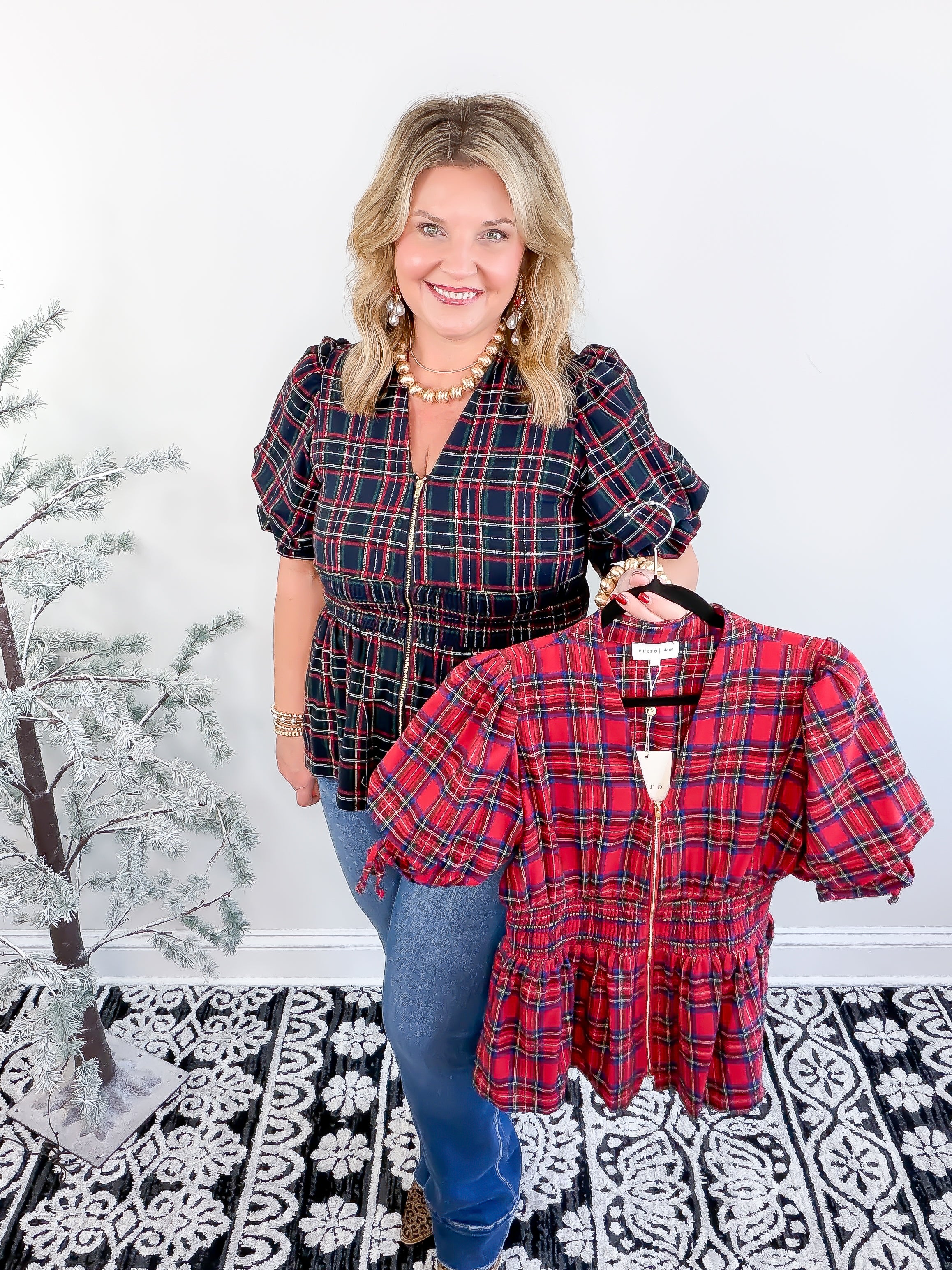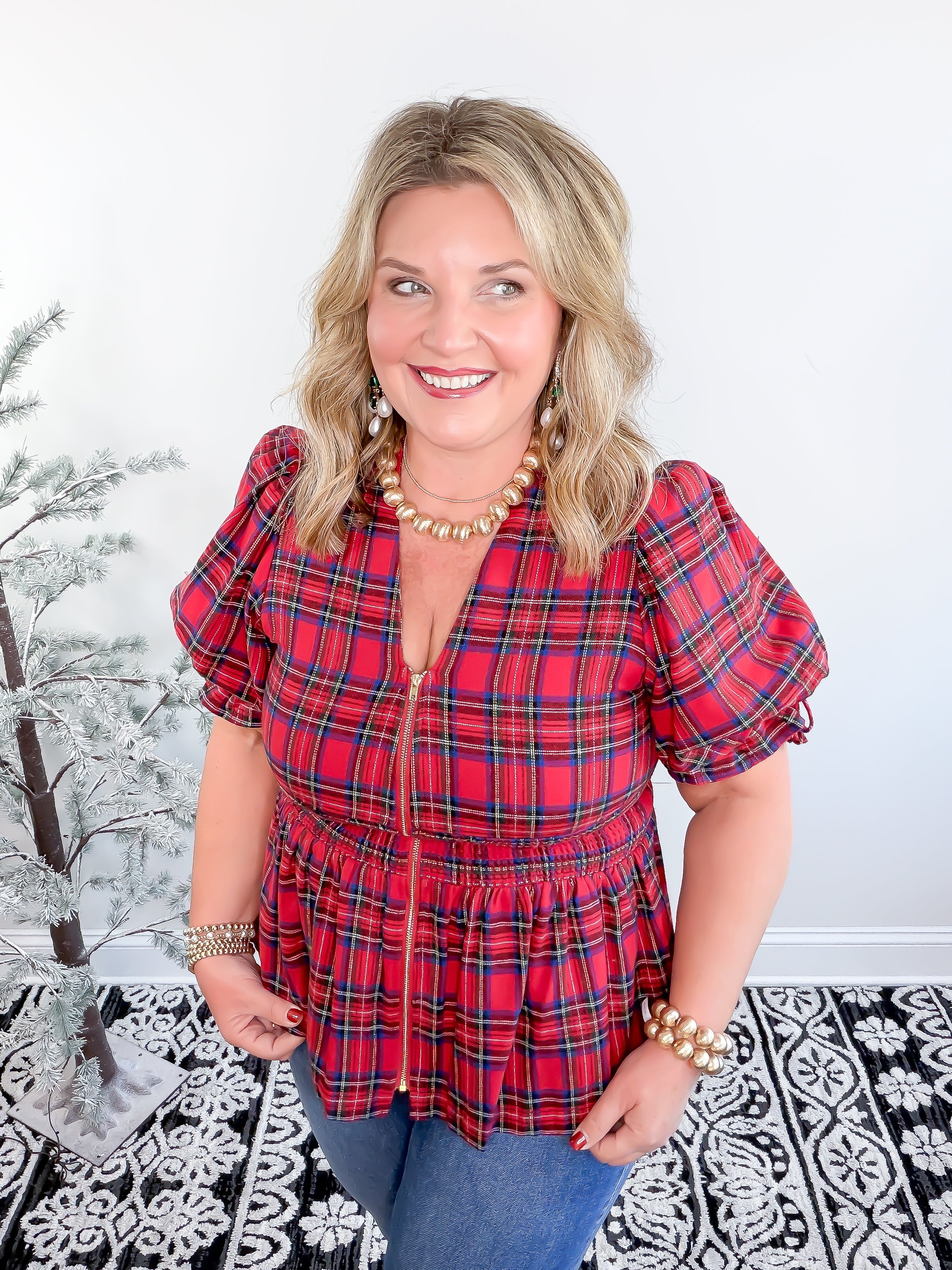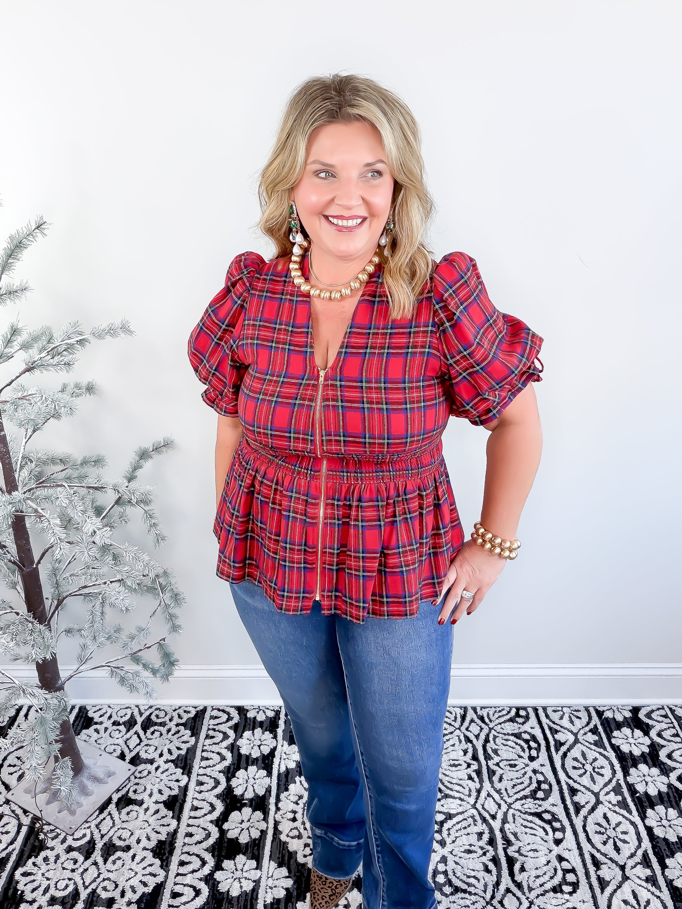 This playful red Sweet & Smocked blouse brings sweet charm with its short puff sleeves and smocked waist that hugs just right. Lightweight and woven for comfort, it features cute tie accents at the sleeves and a handy front zipper closure. Unlined and non-sheer, it’s perfect for breezy, stylish days.