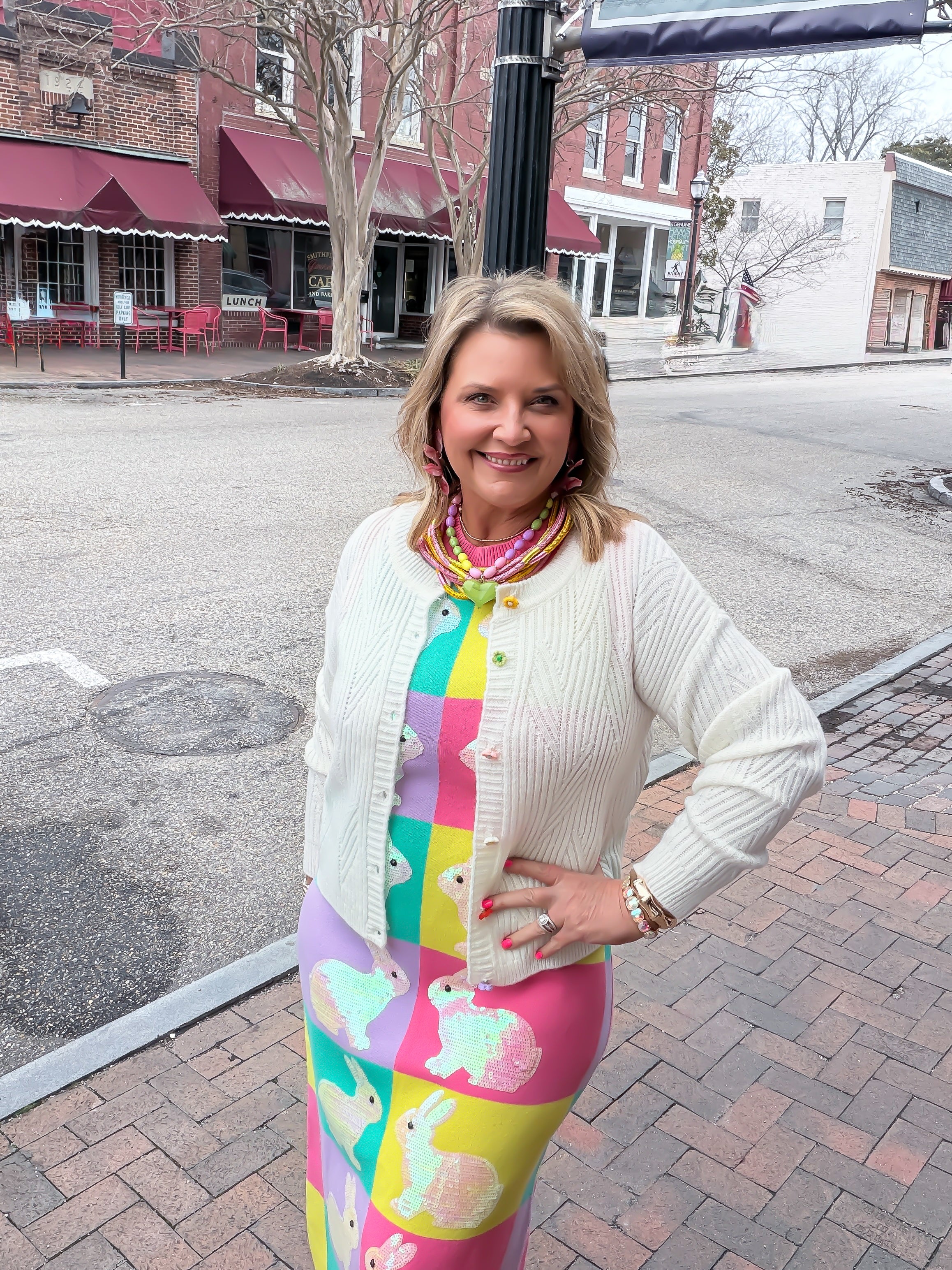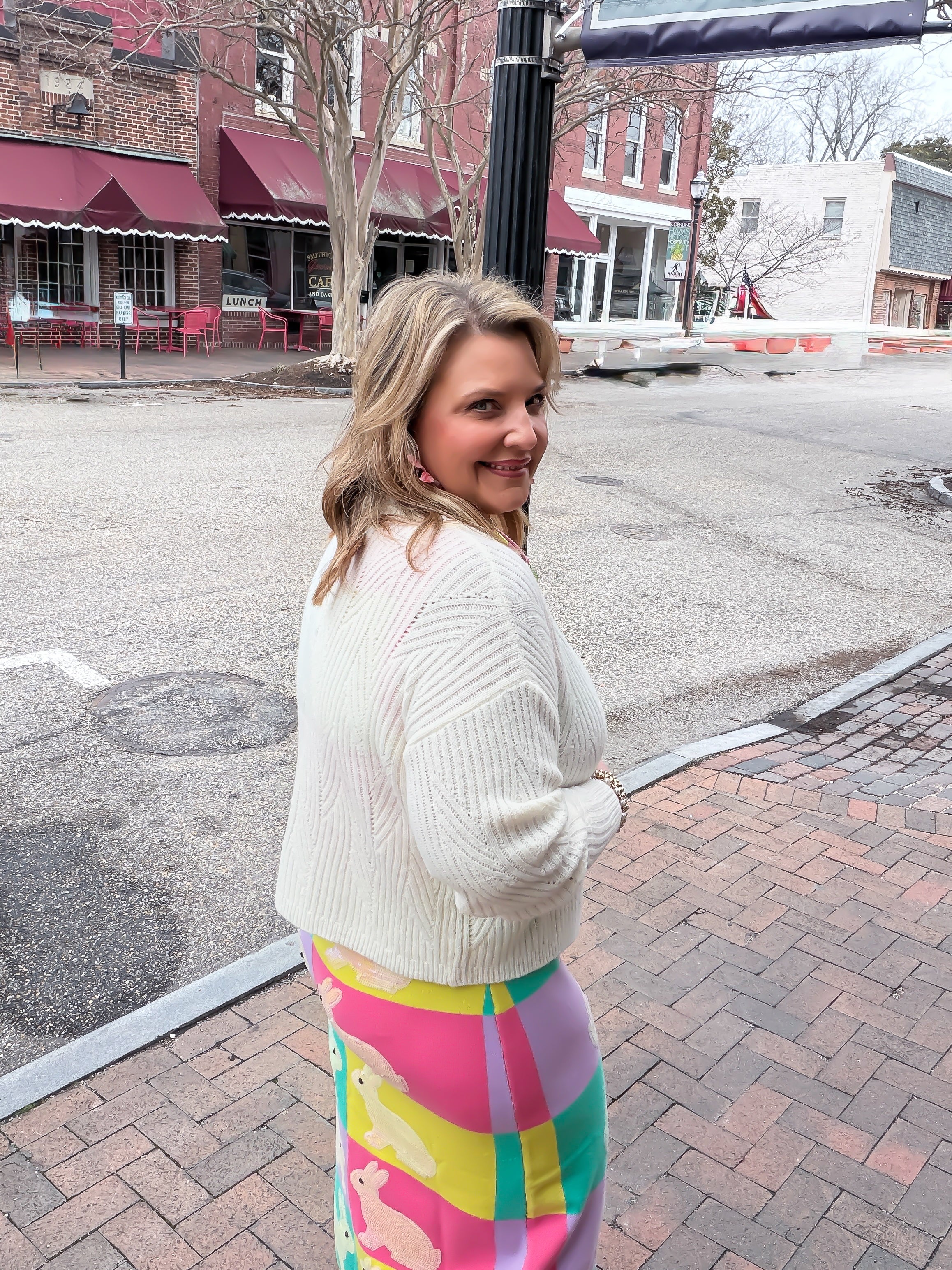 Add a touch of storybook charm to your wardrobe with this Bloom Button ultra-cozy textured knit cardigan. Featuring playful rainbow flower buttons and a soft chevron pattern, it’s the perfect blend of whimsical style and effortless comfort.