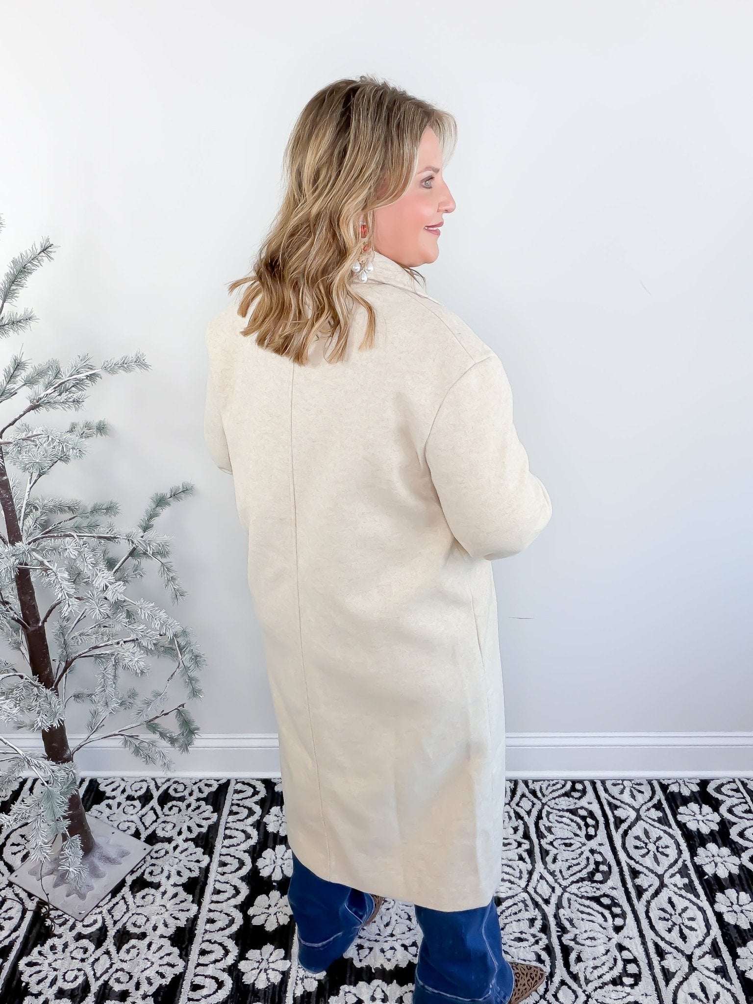 Step out in style with The Sleek Street Coat, a playful twist on classic sophistication. This felted double-breasted duster features a sharp lapel that adds a dash of attitude to your everyday look. Perfect for layering, it keeps you cozy while turning heads wherever you go. Embrace the city streets with confidence and flair in this chic, easy-to-wear essential.