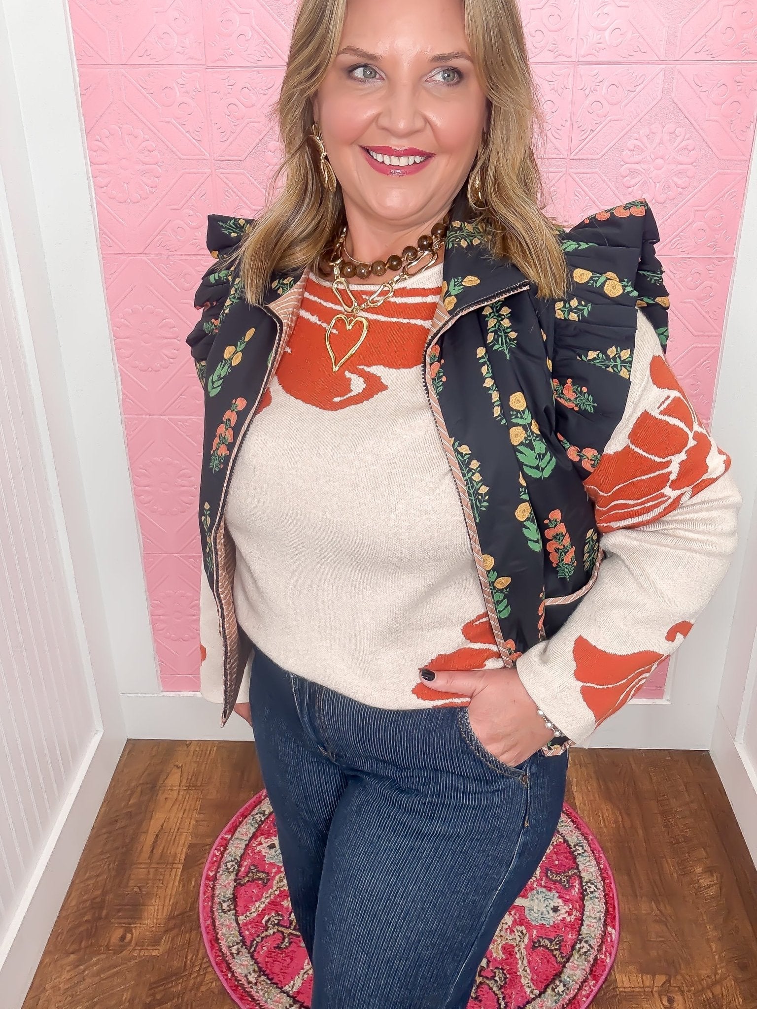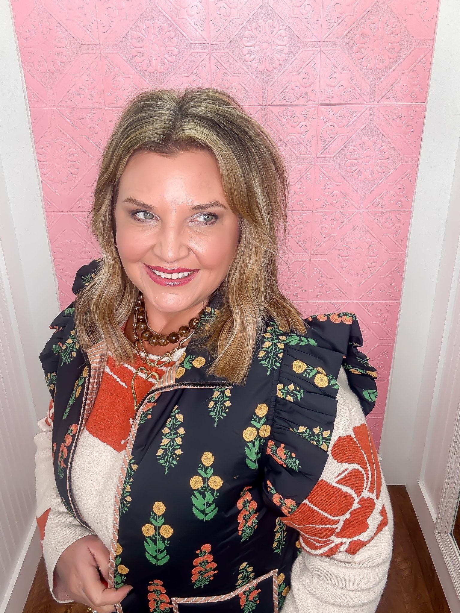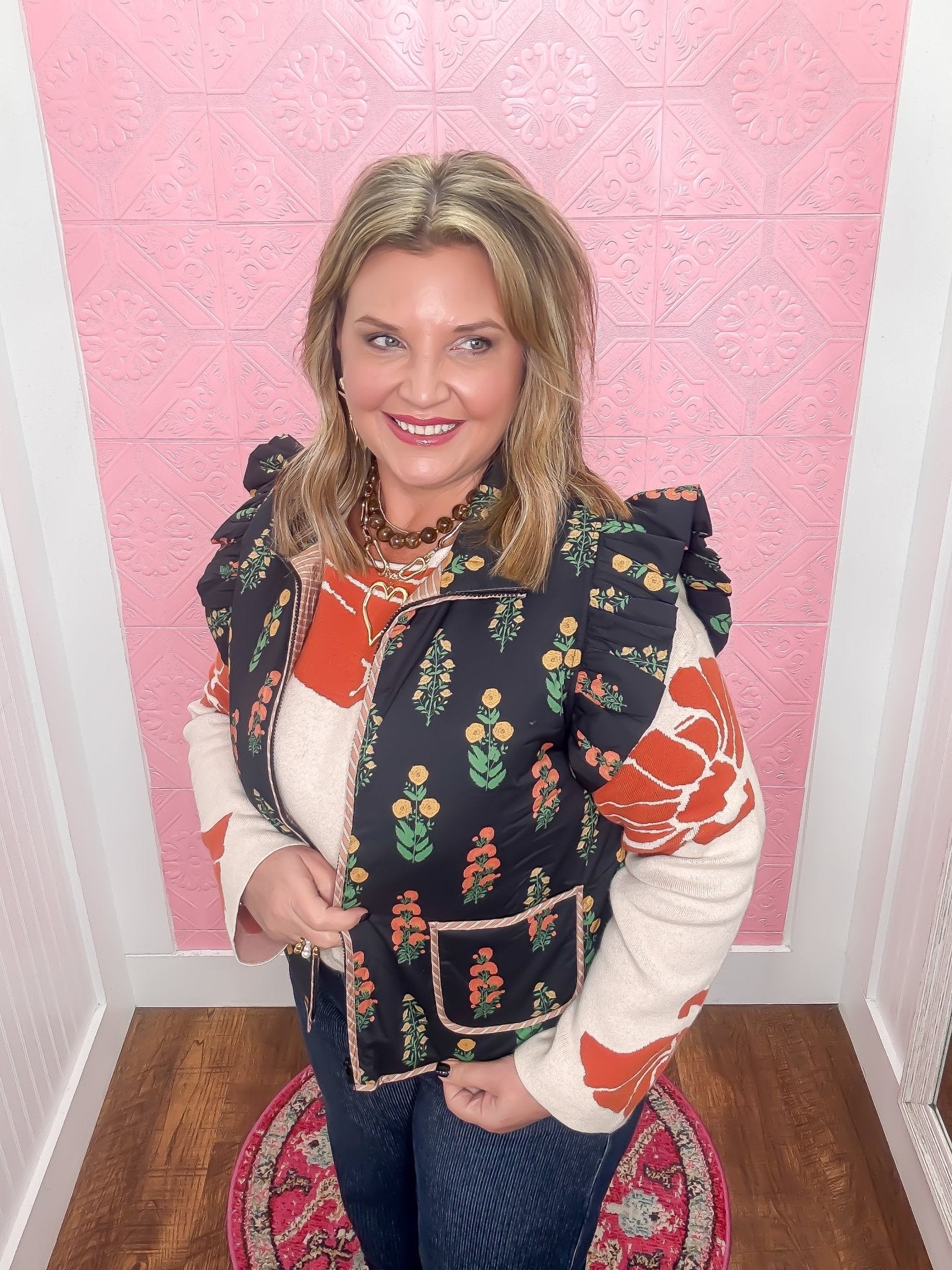 Add a splash of charm to your wardrobe with the Amberleaf Ruffle Sleeve Vest. Featuring a lively floral print, easy zipper closure, and handy pockets, this vest effortlessly blends style and function. The playful ruffle sleeves bring a flirty flair, making it perfect for layering on breezy days or dressing up your casual look.