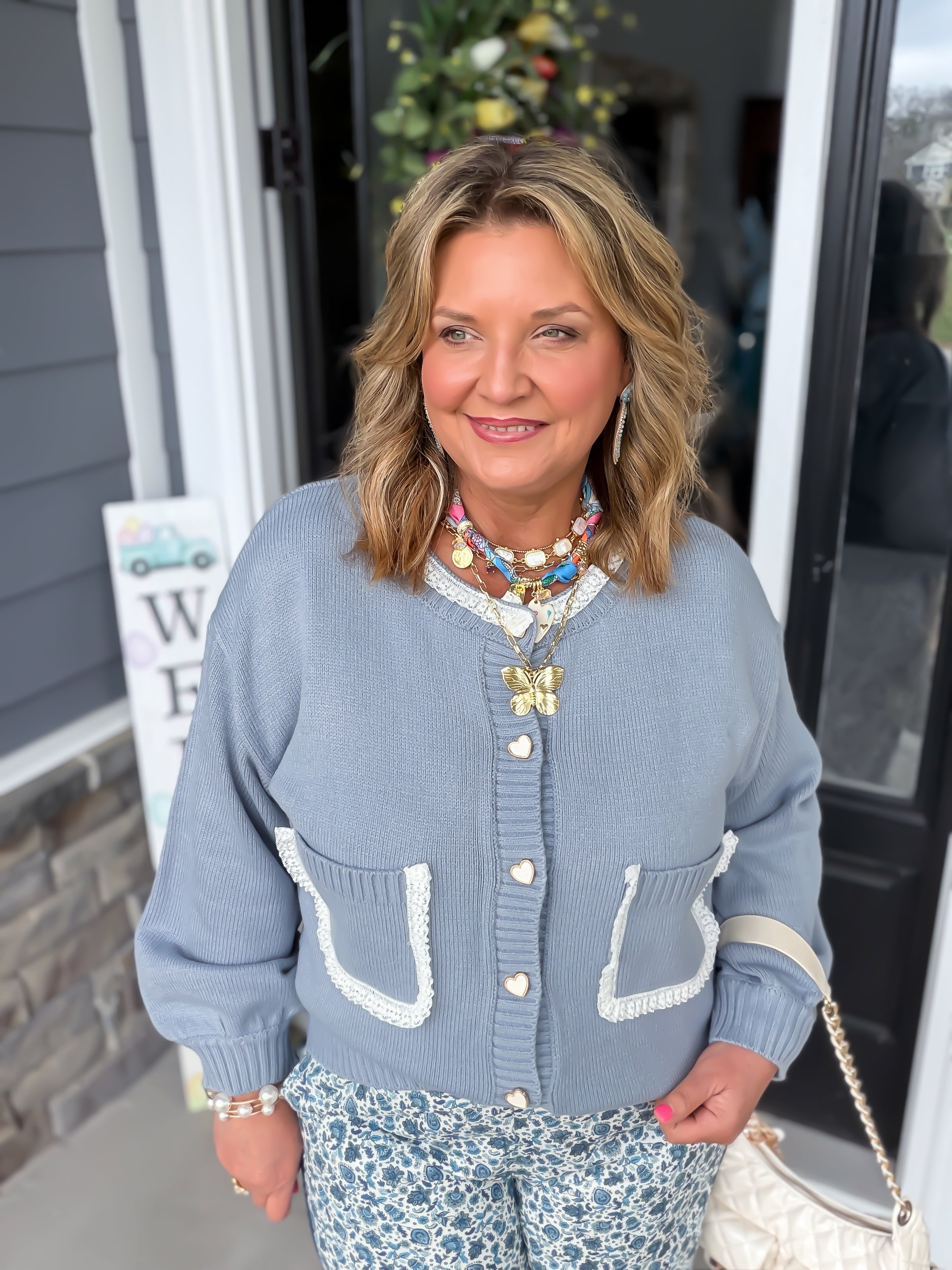 Elevate your everyday style with the Aria Lace Trim Cardigan, the ultimate blend of feminine charm and cozy comfort. Crafted from a premium soft knit, this vintage-inspired sweater features delicate scalloped lace detailing and dreamy gold-rimmed heart buttons. Whether you’re leaning into the coquette aesthetic or looking for the perfect brunch layer, this cardigan adds a touch of sweetness to any outfit.