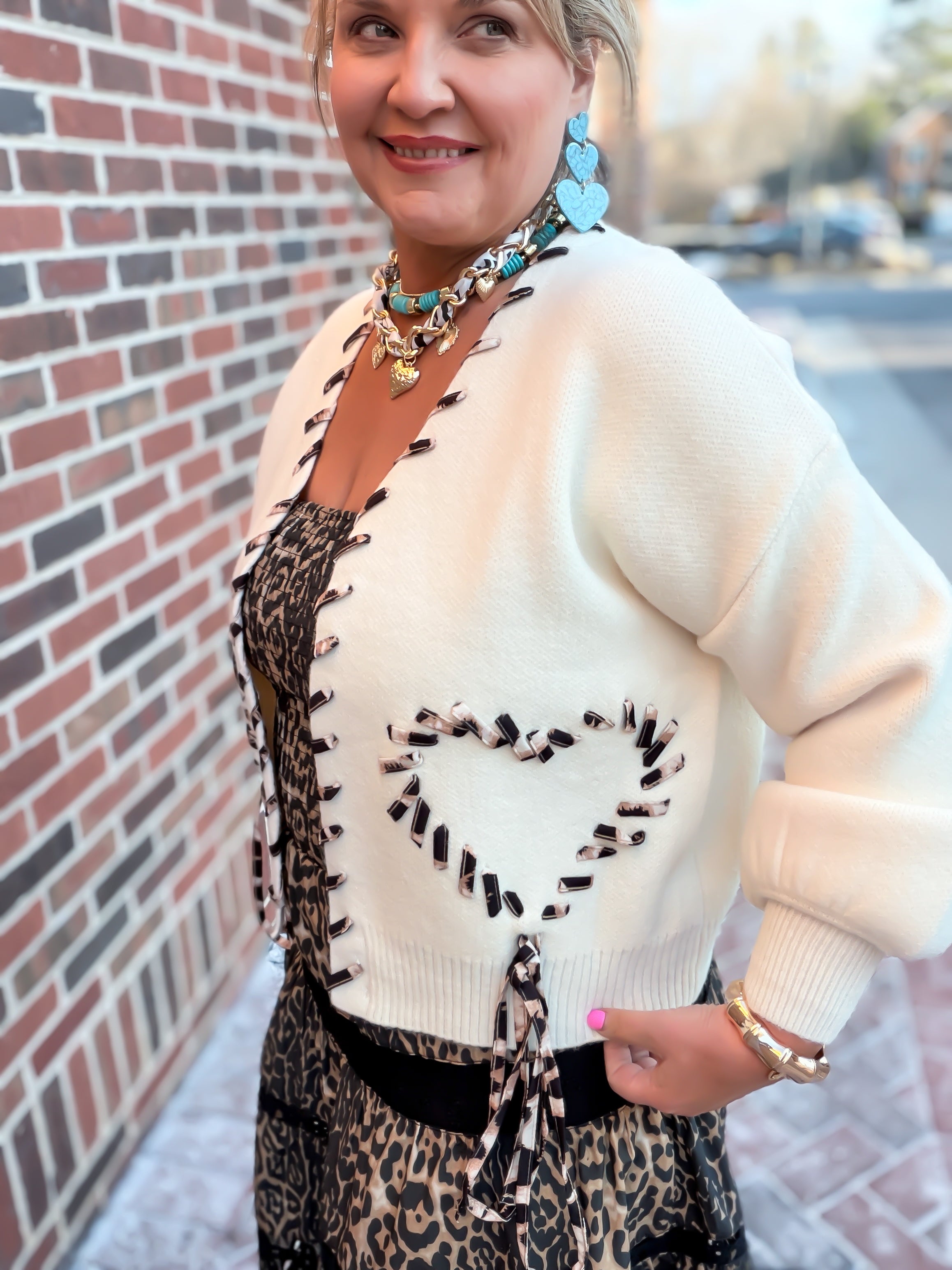 Elevate your everyday wardrobe with the Wild at Heart stunning leopard print lace-up cardigan. Crafted from a premium, ultra-soft knit fabric, this versatile sweater features a unique animal print whipstitch detail that traces the neckline, sleeves, and front bodice into charming heart shapes. With its relaxed fit, classic V-neck, and chic ribbed cuffs, this cardigan is the perfect blend of cozy comfort and bold, boutique-style fashion.