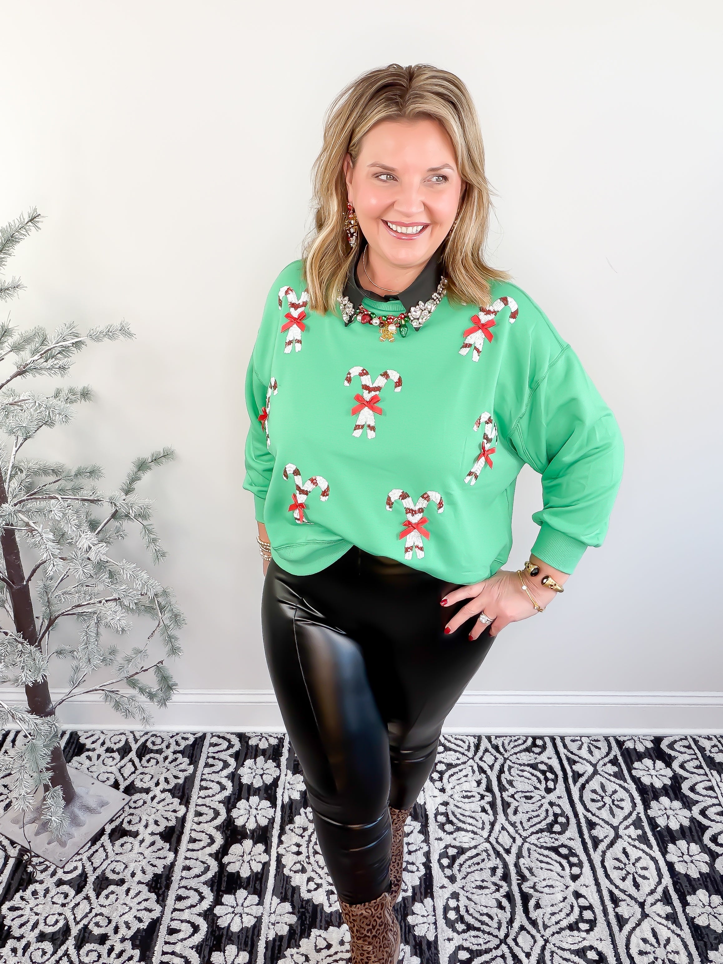 Get cozy this holiday season with the Peppermint Shine Sweatshirt, featuring a playful sequin candy cane pattern that sparkles with festive cheer. Its soft fabric keeps you comfy while adding a touch of holiday magic to your outfit. Perfect for spreading joy and staying warm during all your seasonal celebrations!