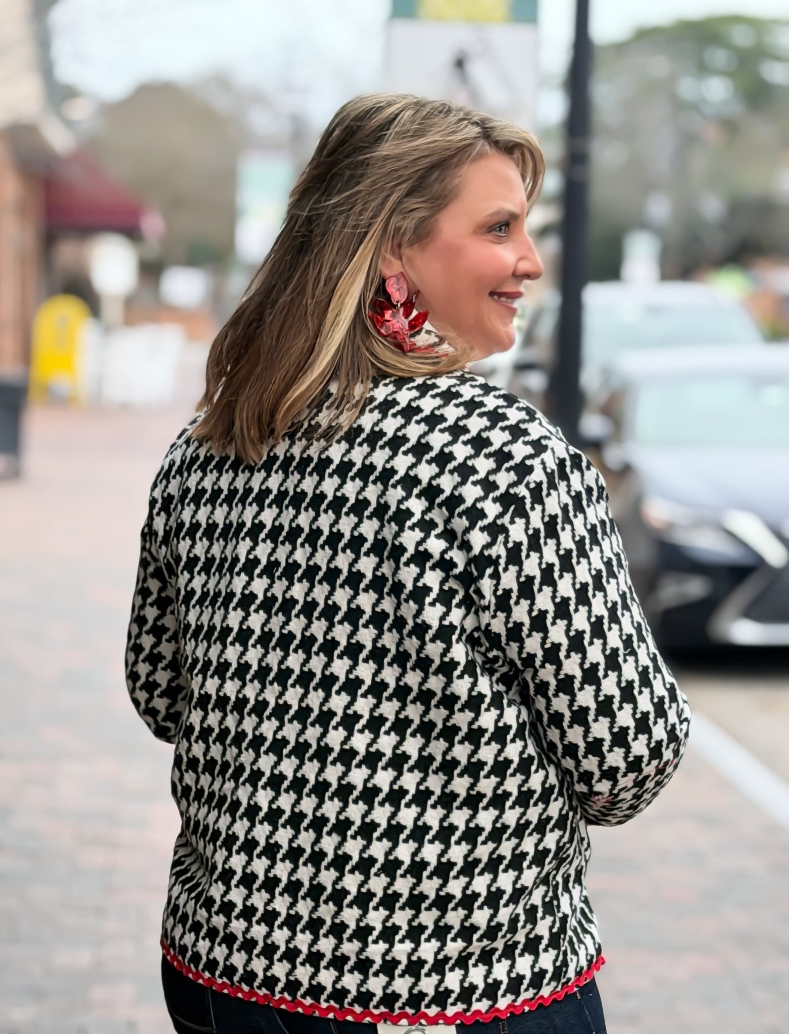 Elevate your wardrobe with this charming Zigzag houndstooth jacket that's equal parts sophisticated and fun. Featuring a striking zigzag trim tape detail on the front pockets and a classic button-front closure, this piece brings personality to any outfit. Fully lined for comfort and durability, it's the perfect layer for transitioning between seasons. Whether you're dressing up for brunch or keeping it casual, this jacket proves that timeless patterns never go out of style.