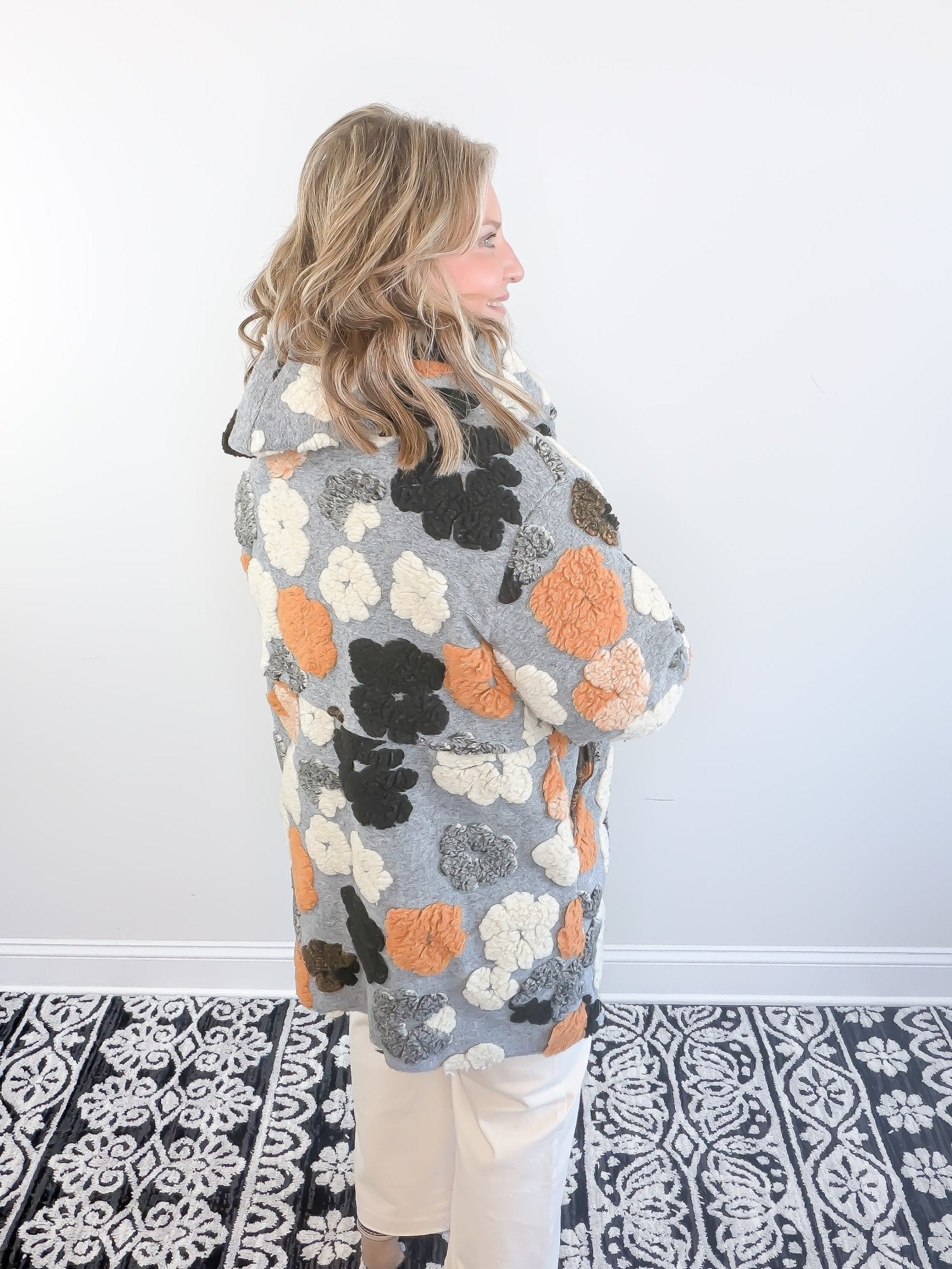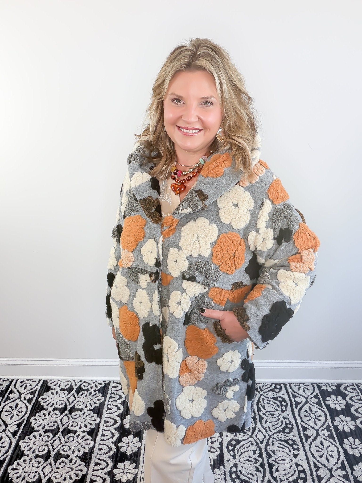 Wrap yourself in whimsy with the Floral Haven Coat, where chunky embroidered flowers bloom across cozy fabric. This hoodie coat blends playful charm with warmth, making it your go-to piece for fresh, fun style on chilly days. Embrace a carefree vibe while staying snug and stylish all season long.