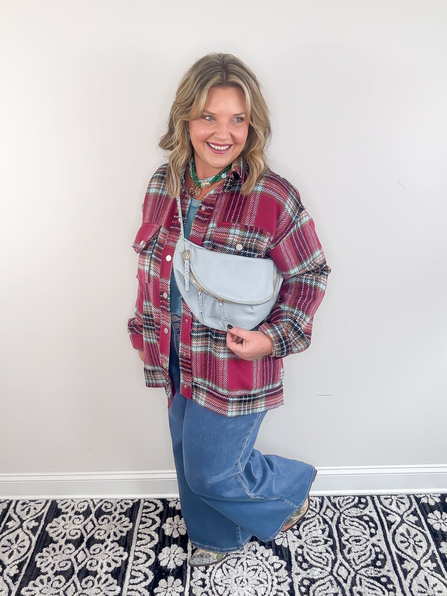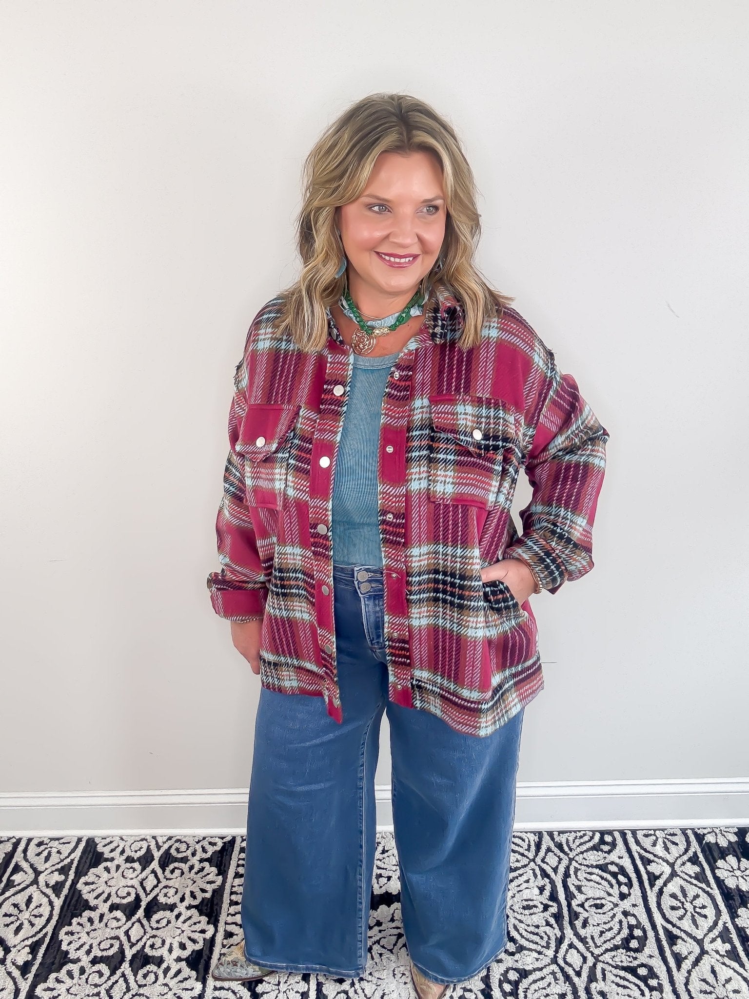 Bring a classic vibe to your wardrobe with this charming plaid shacket, boasting a relaxed, slouchy fit. It features snap buttons down the front alongside handy side and chest pockets with trendy raw-edge accents. Perfect for layering, this playful piece is your new go-to for chilly days and stylish fall looks.